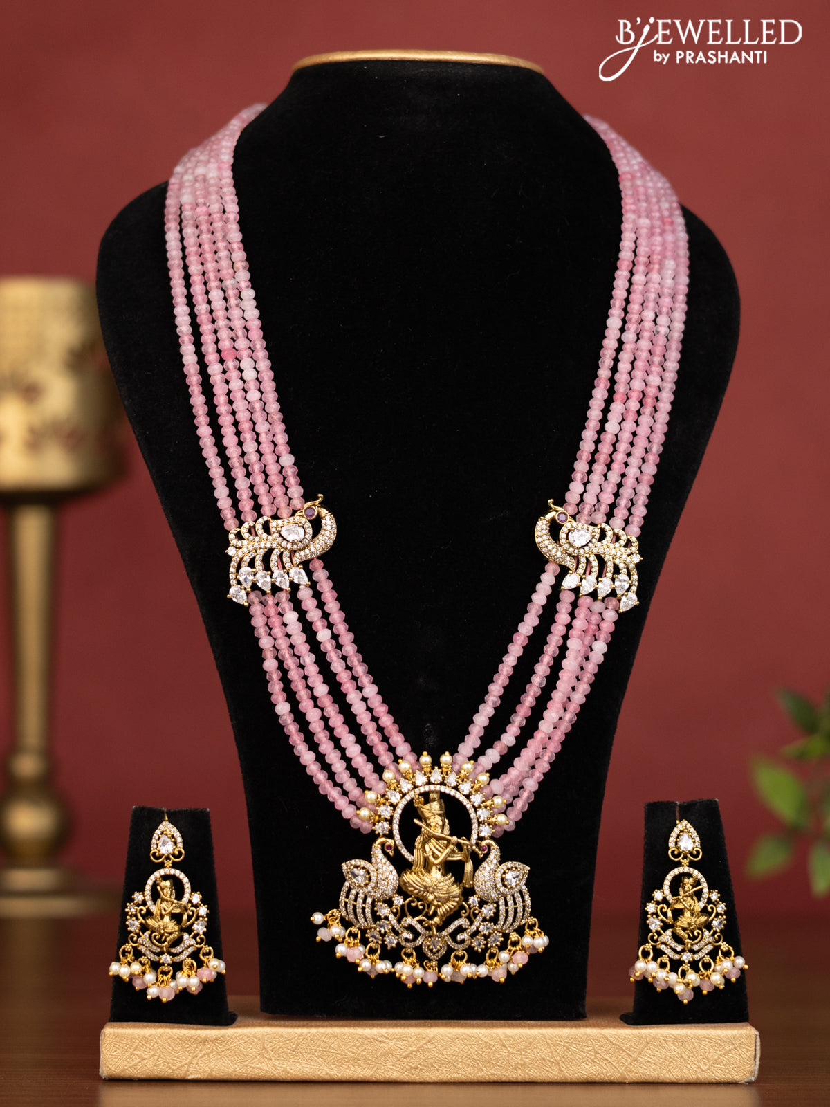 Beaded multilayer baby pink necklace krishna pendant with cz stones and pearl & beads hanging in victorian finish