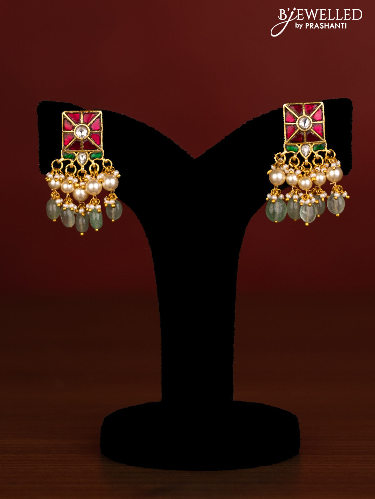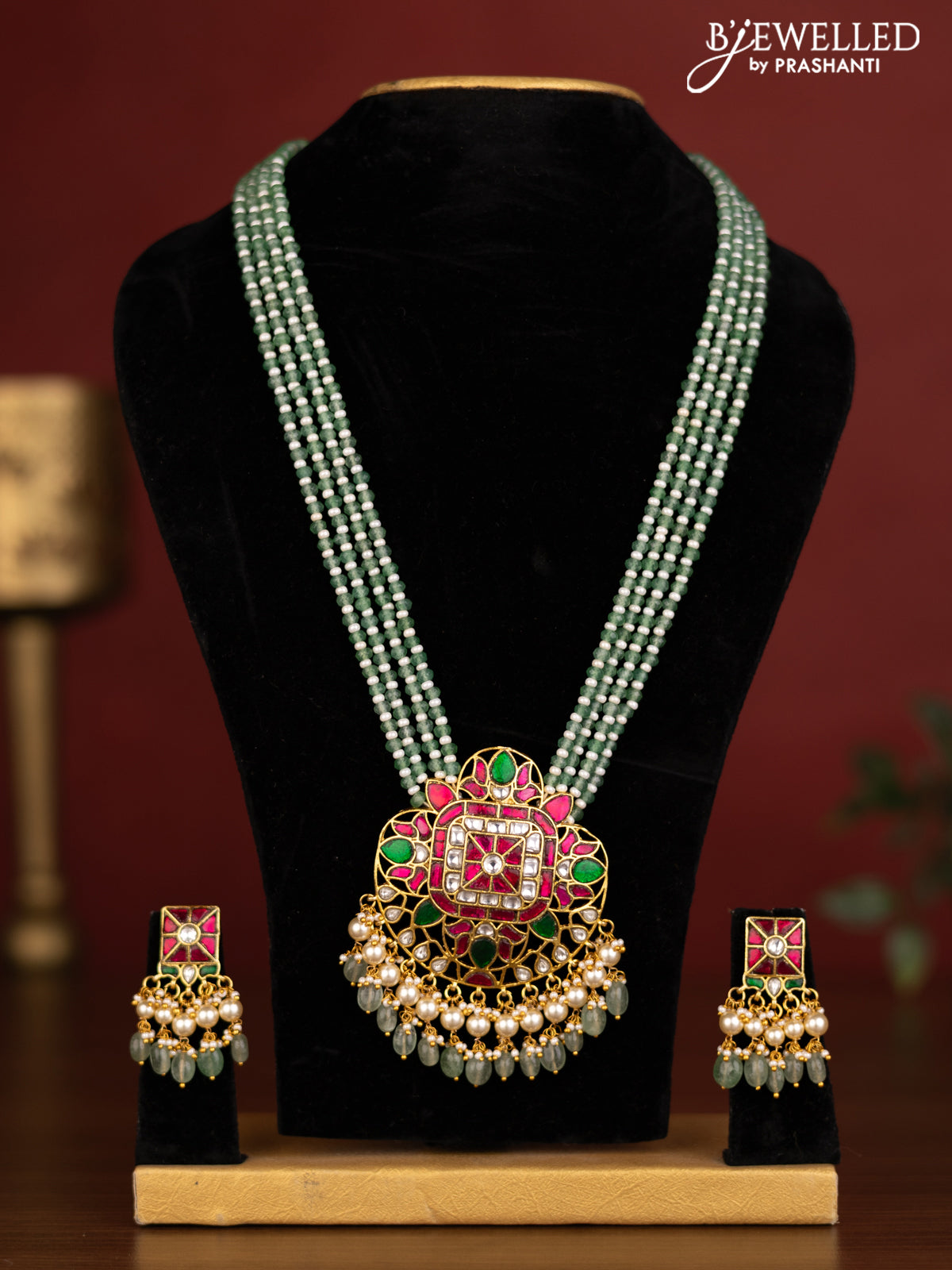 Beaded multilayer green haaram with jadau kundan stones and natural beads & pearl hangings