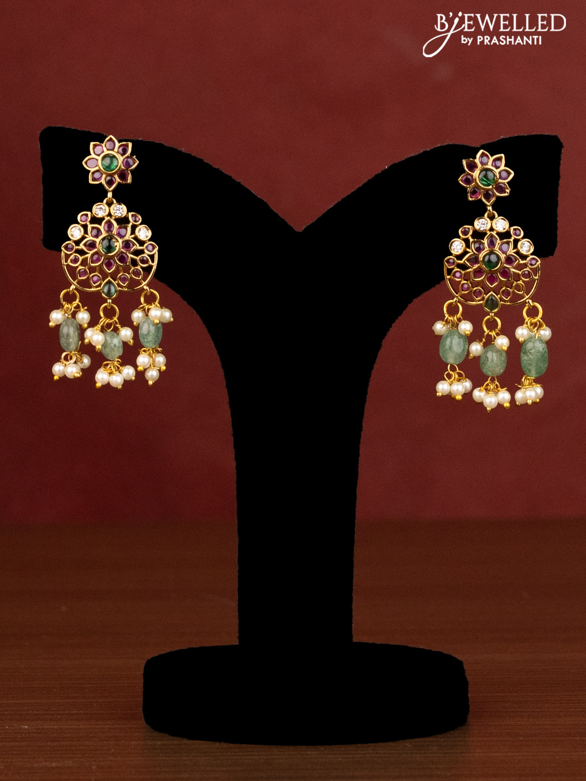Beaded multilayer green haaram with kemp stones and beads & pearl hangings
