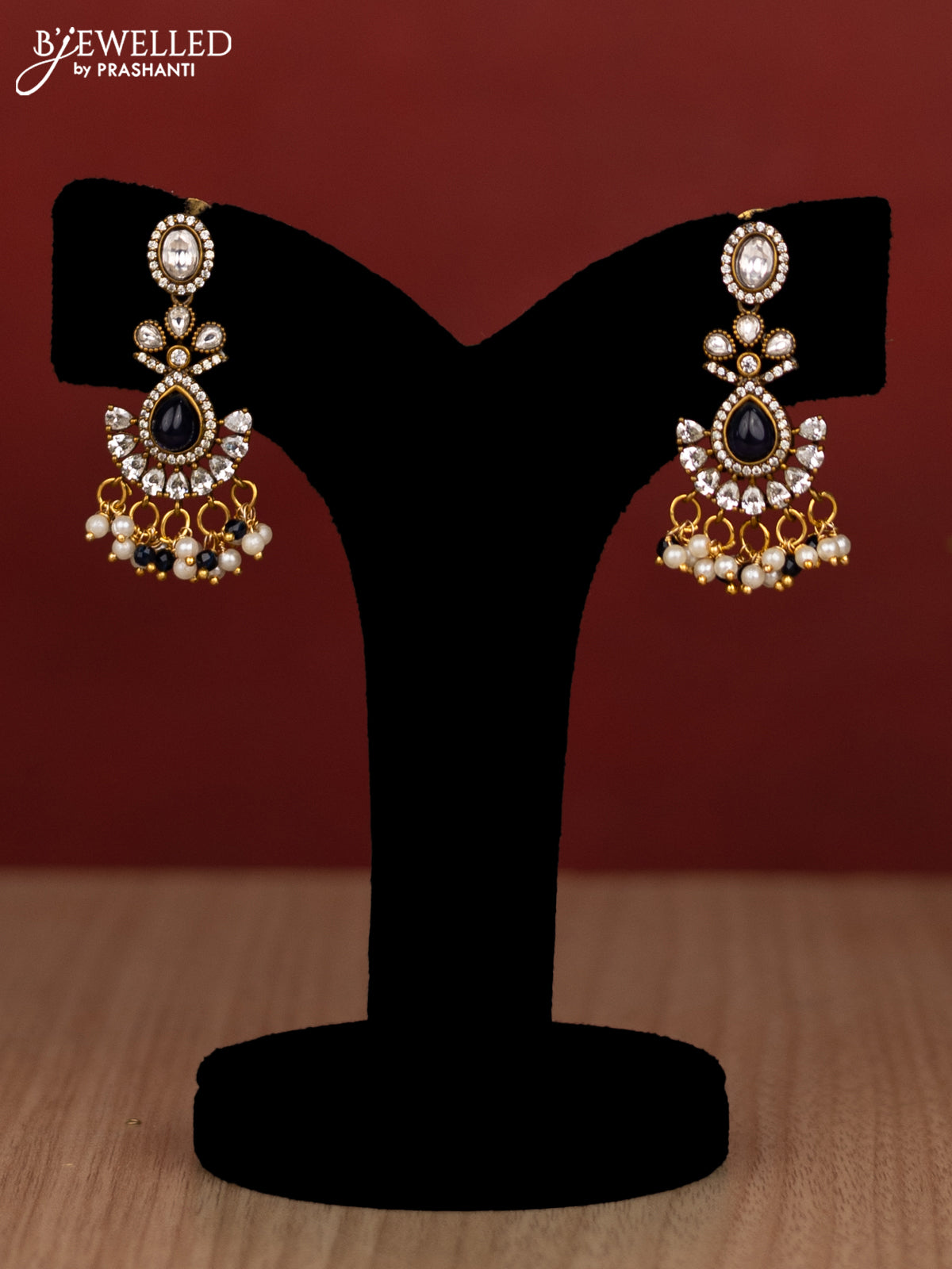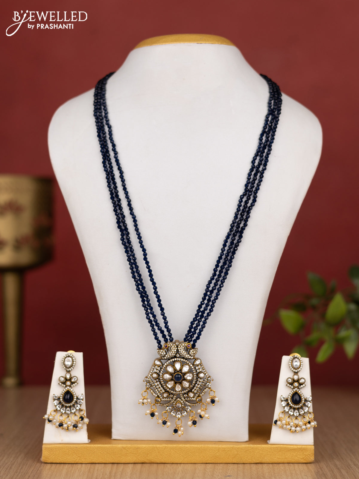 Beaded triple layer blue haram peacock design with sapphire & kundan cz stones and pearl & beads hanging in victorian finish
