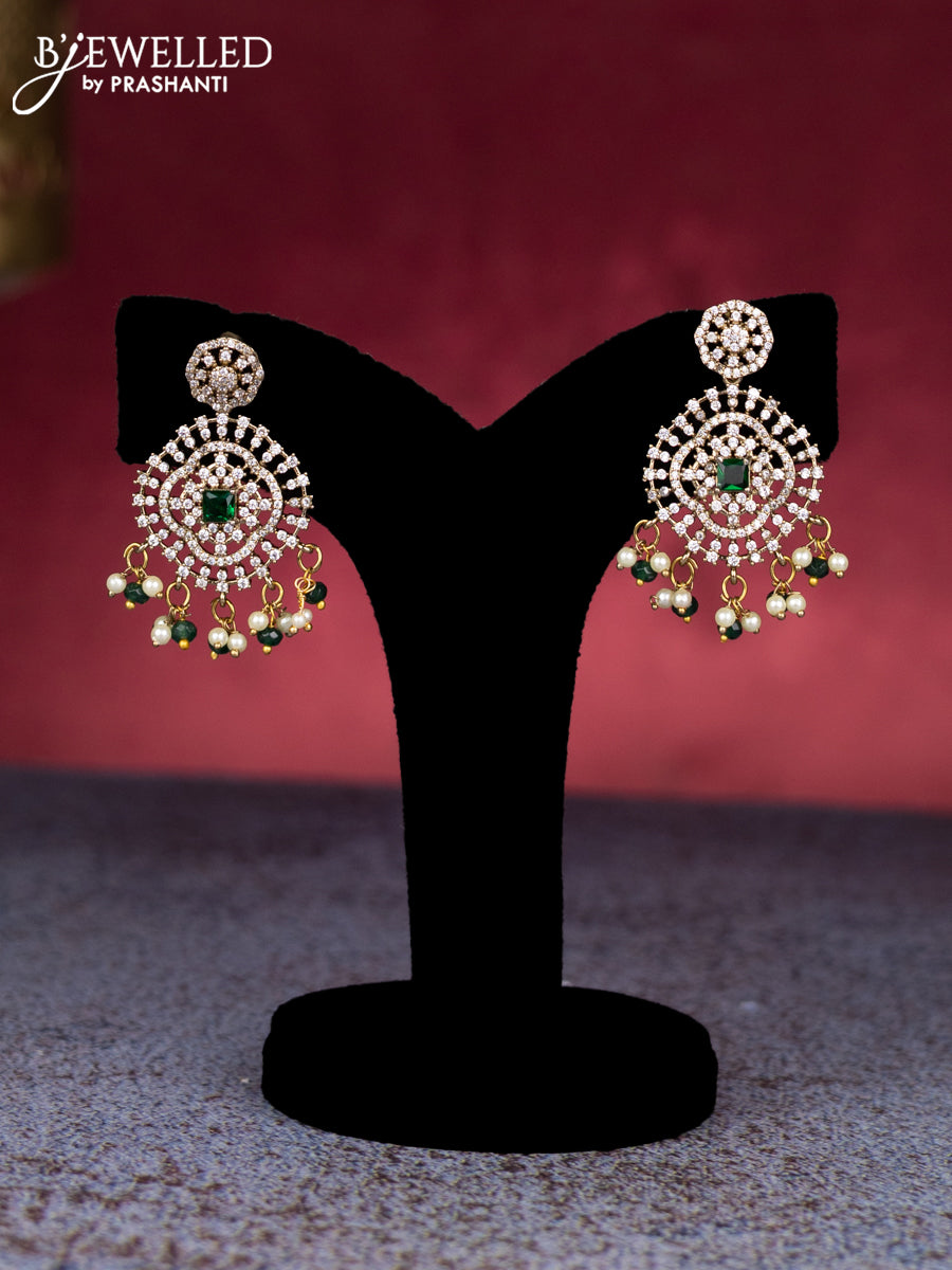 Beaded triple layer green necklace with emerald & cz stones and pearl & beads hangings in victorian finish