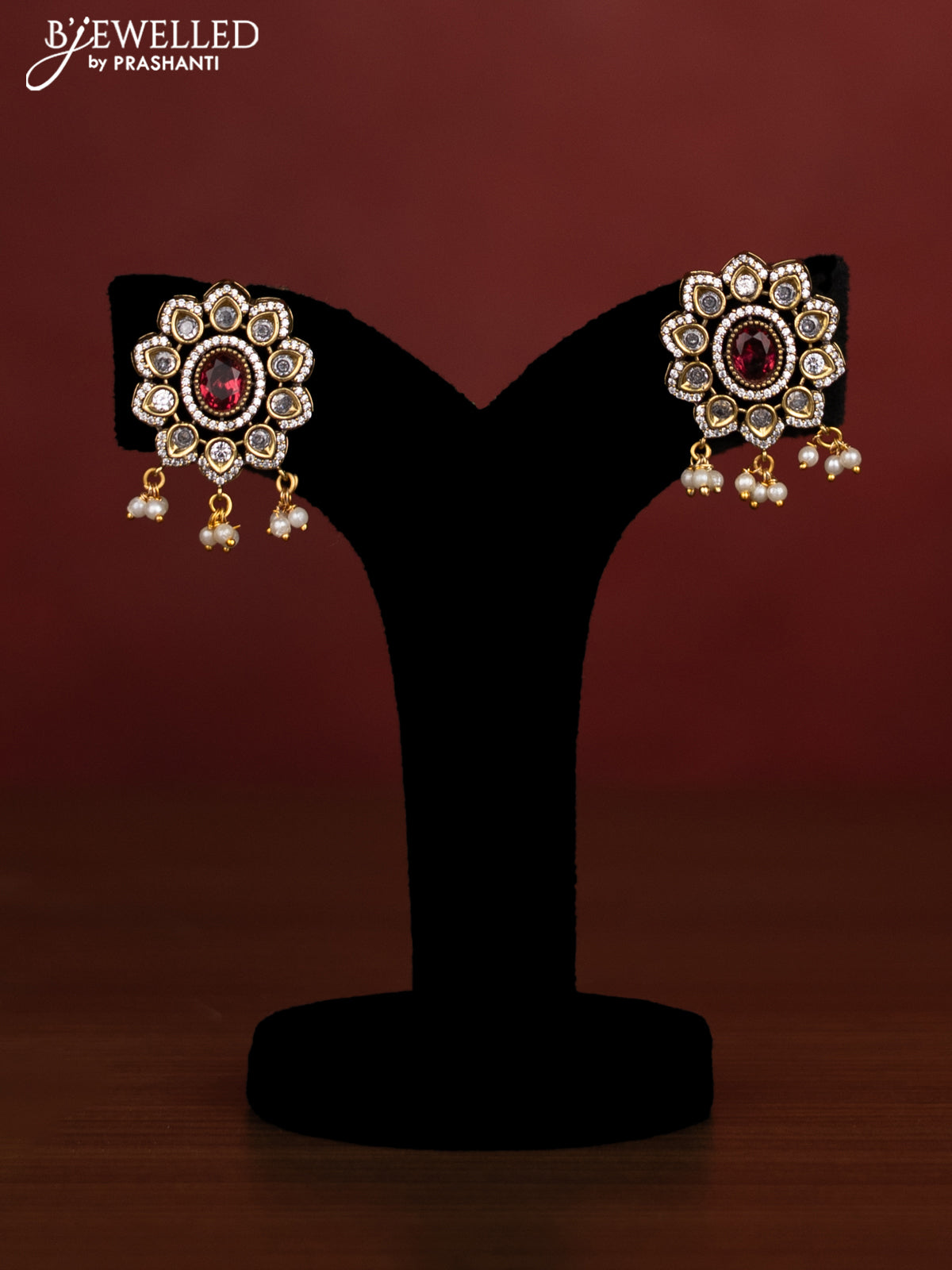 Beaded triple layer maroon necklace with ruby & cz stones and pearl hangings in victotrian finish