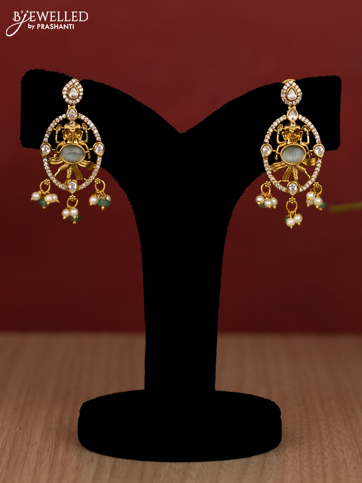 Beaded triple layer mint green haram ganesha pendant with cz stones and pearl & beads hanging in victorian finish