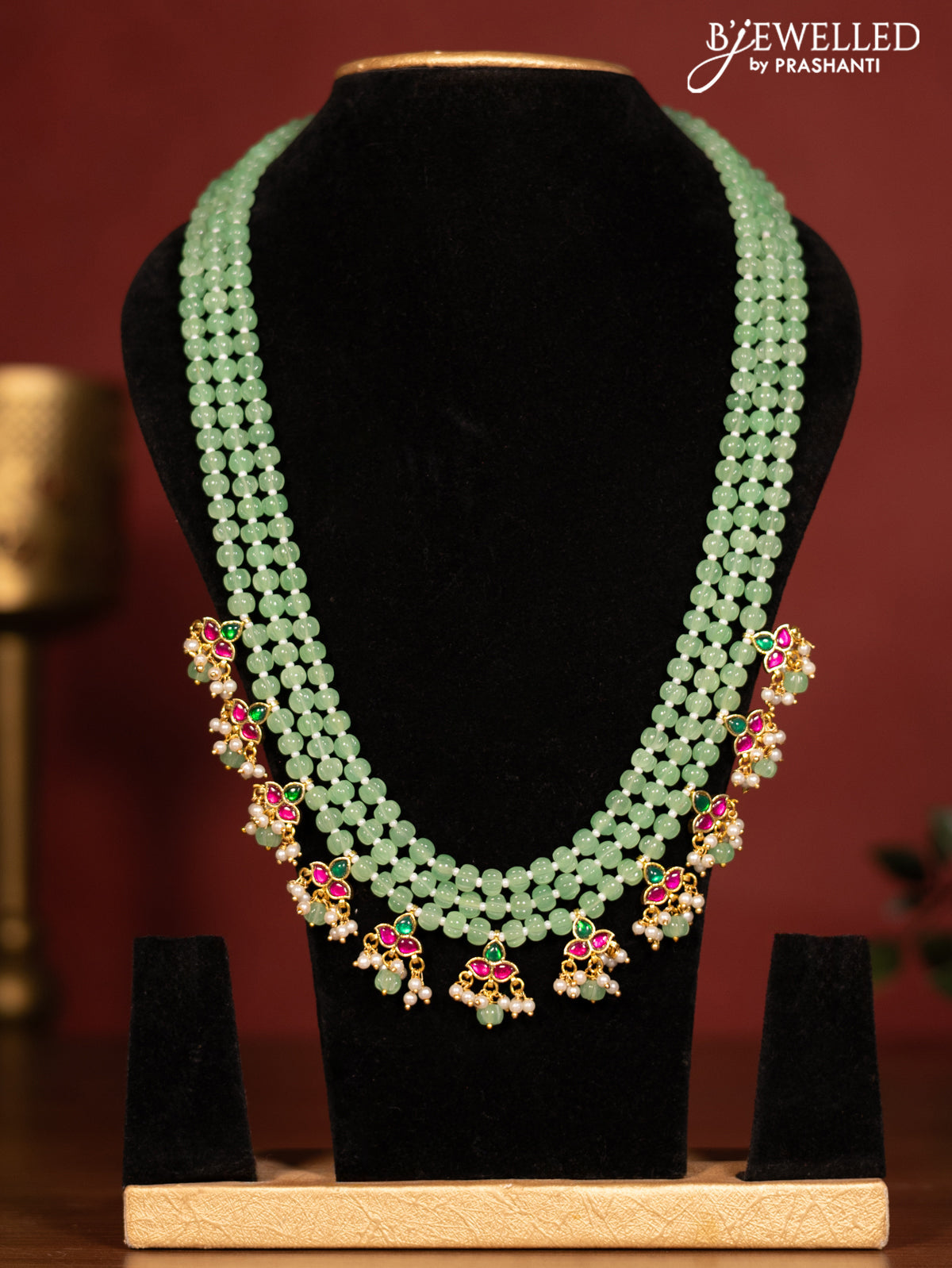 Beaded triple layer mint green necklace with jadau stones pendant and pearl & beads hanging without earrings