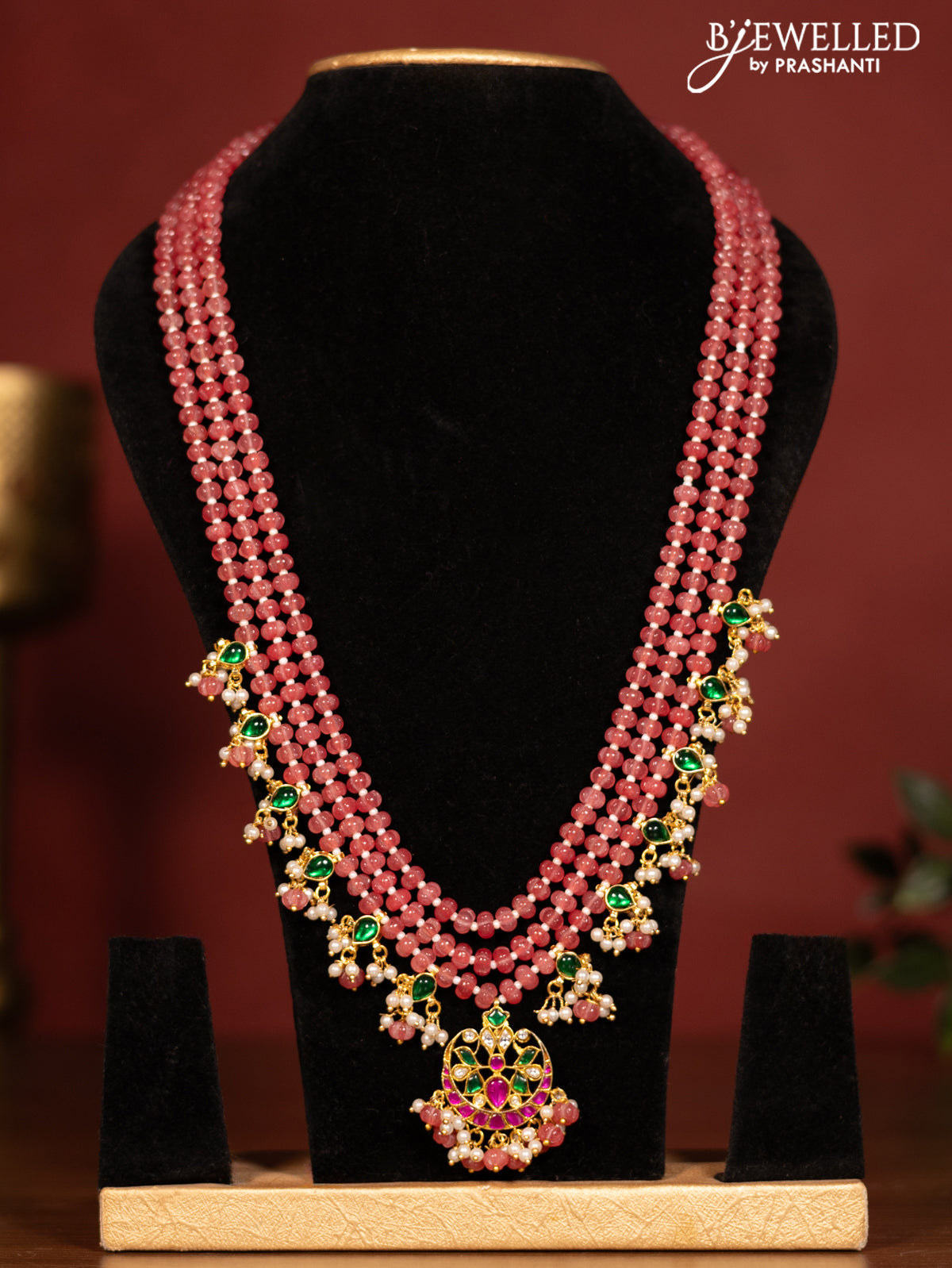 Beaded triple layer pink necklace chandbali pendant with jadau kundan stones and pearl & beads hanging without earrings