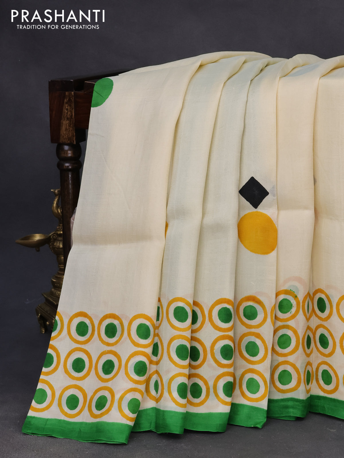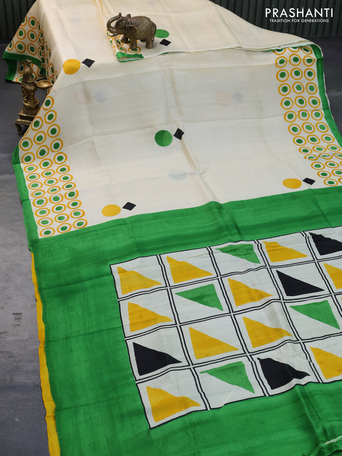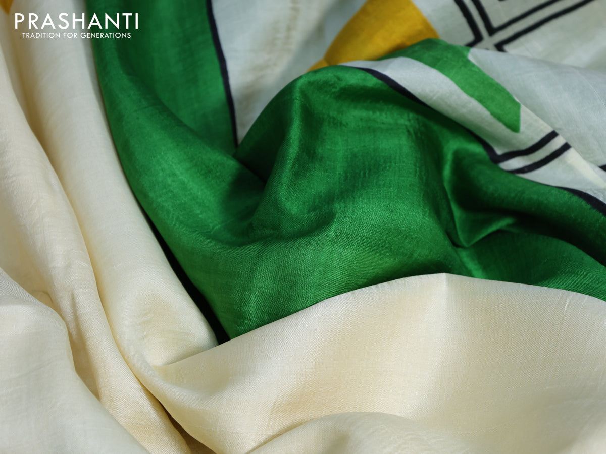Bishnupuri silk saree cream and green with butta prints and printed border