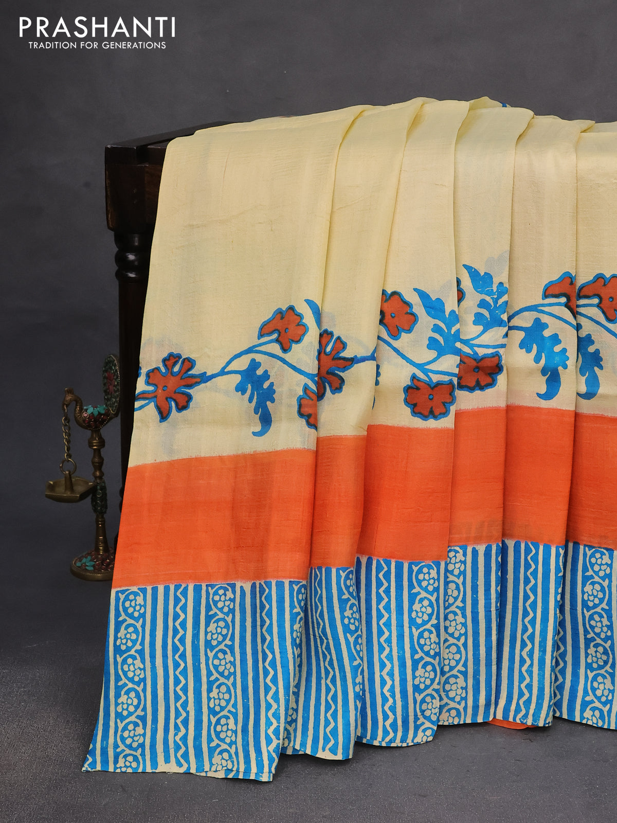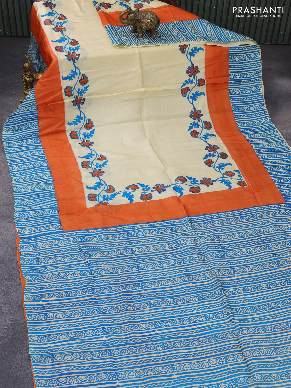 Bishnupuri silk saree cream and orange cs blue with floral prints and printed border