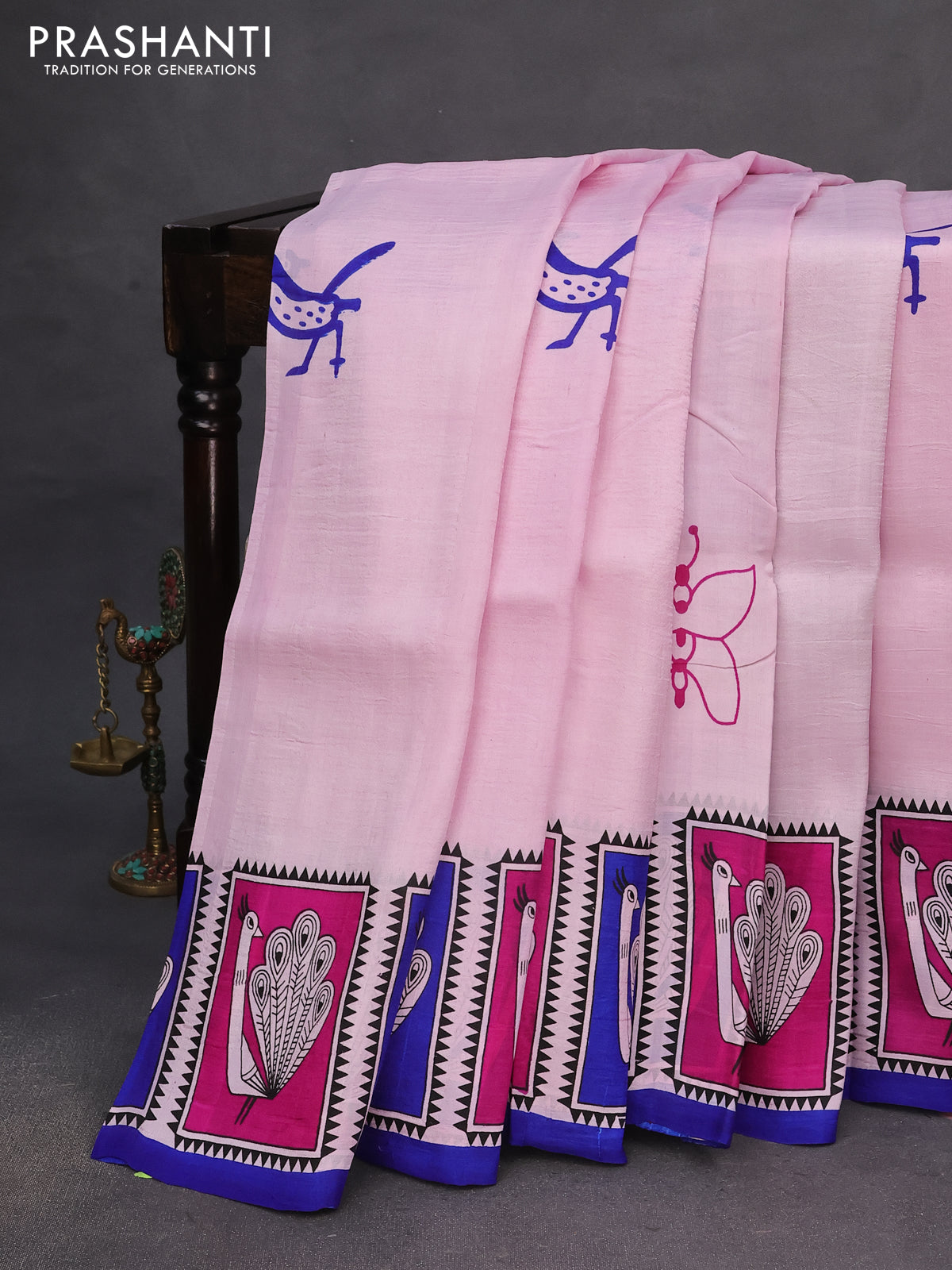Bishnupuri silk saree pastel pink and blue magenta pink with butta prints and printed border