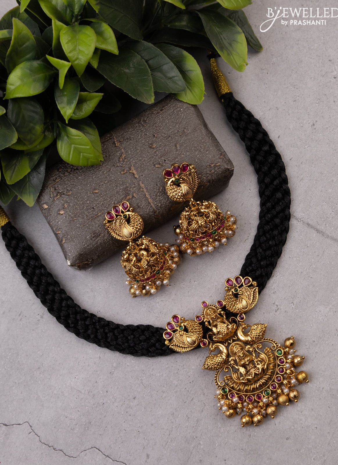 Black thread necklace lakshmi design with kemp stones and pearl & golden beads hanging