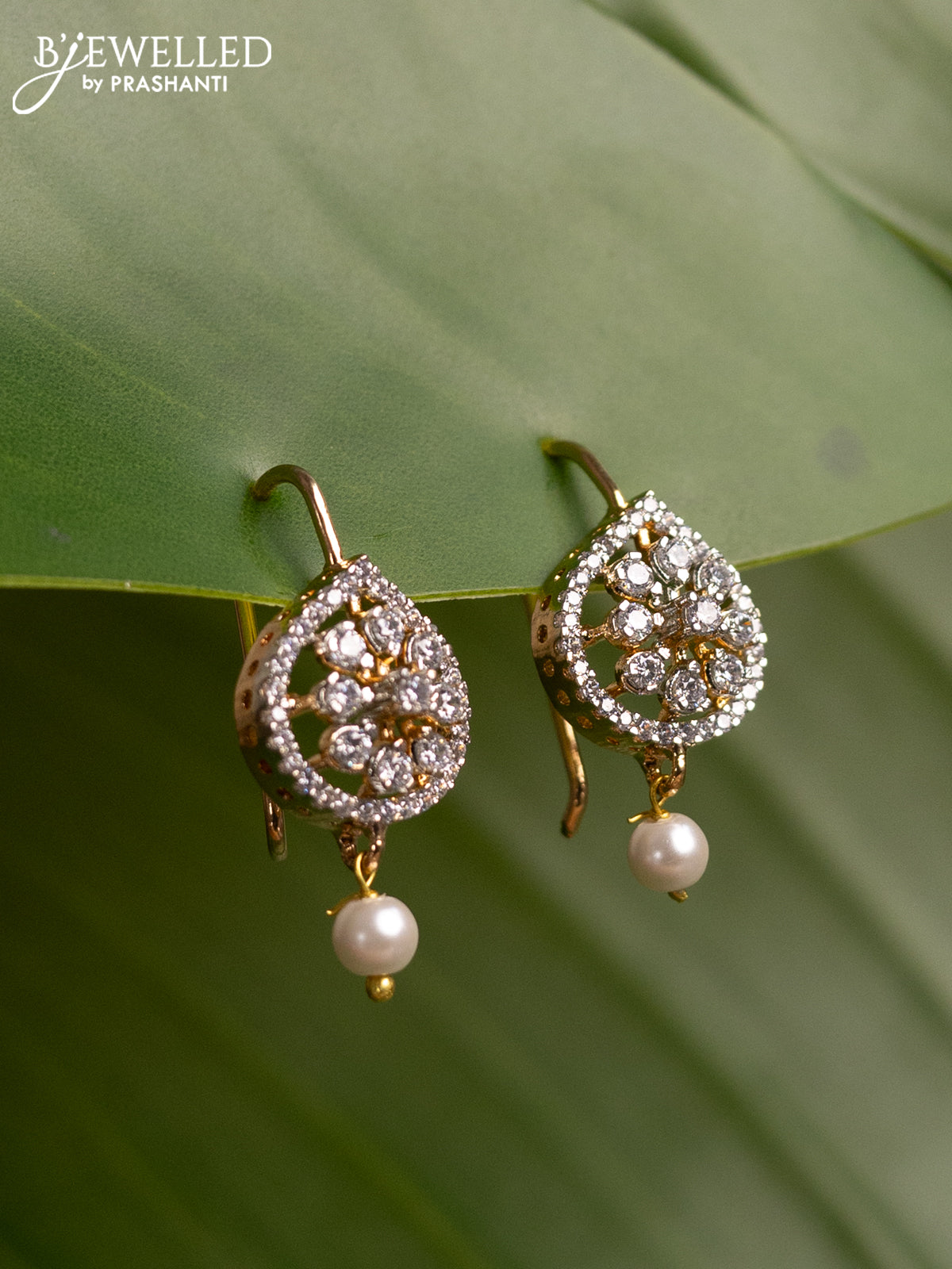 Bugadi earrings with cz stones and pearl hanging in gold finish
