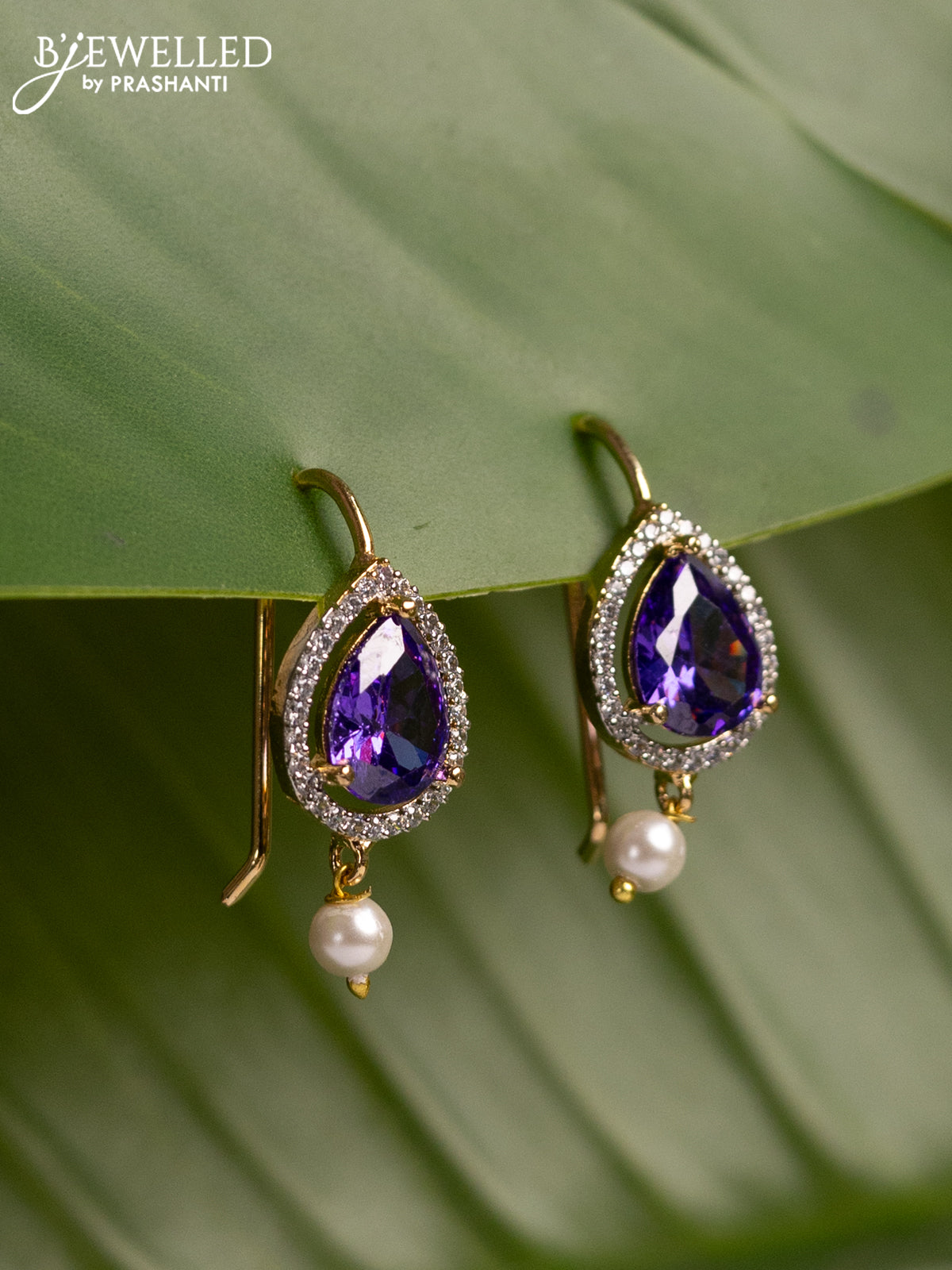 Bugadi earrings with violet & cz stones and pearl hanging in gold finish
