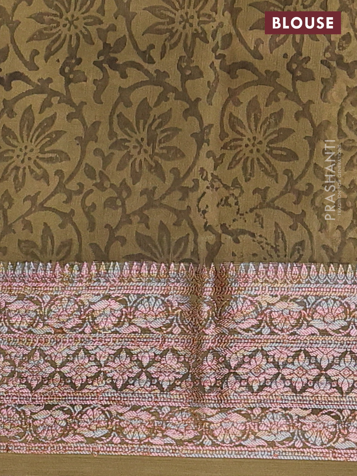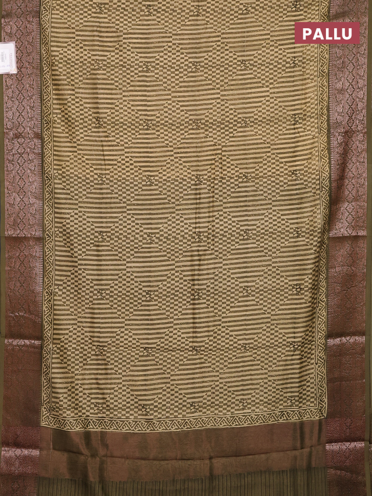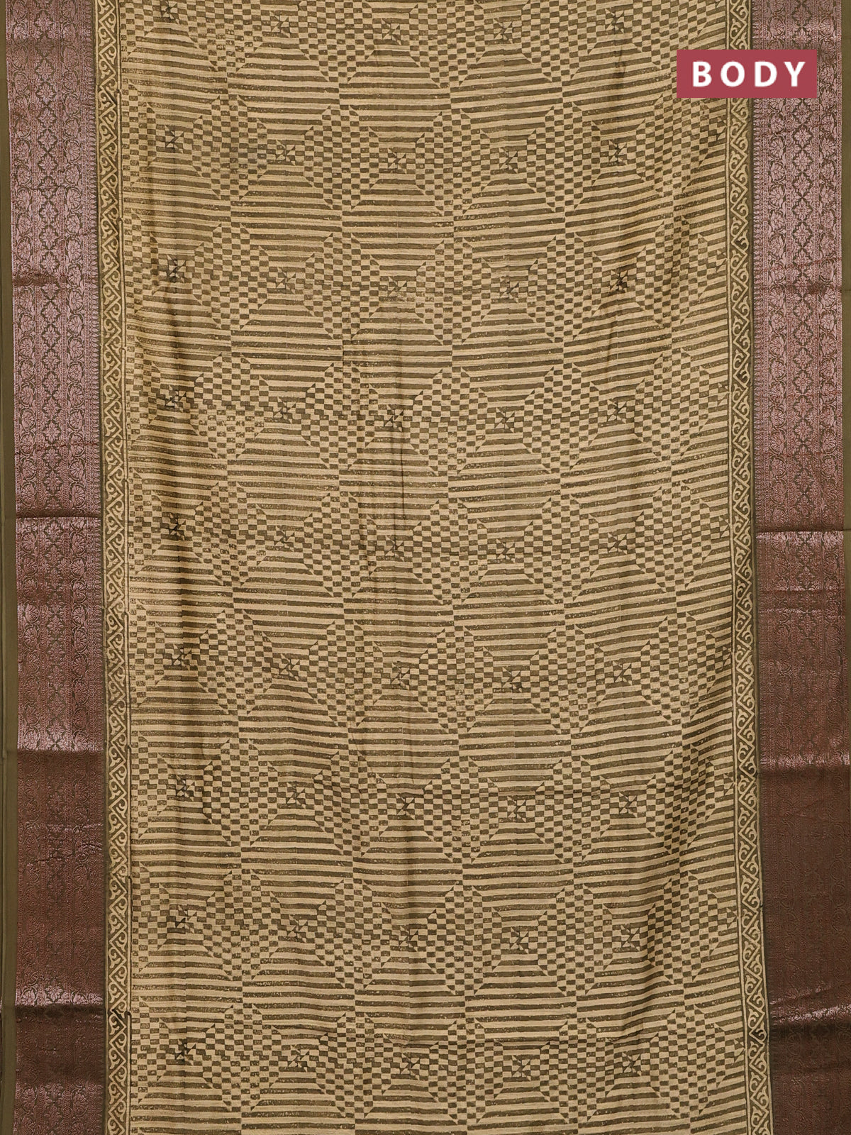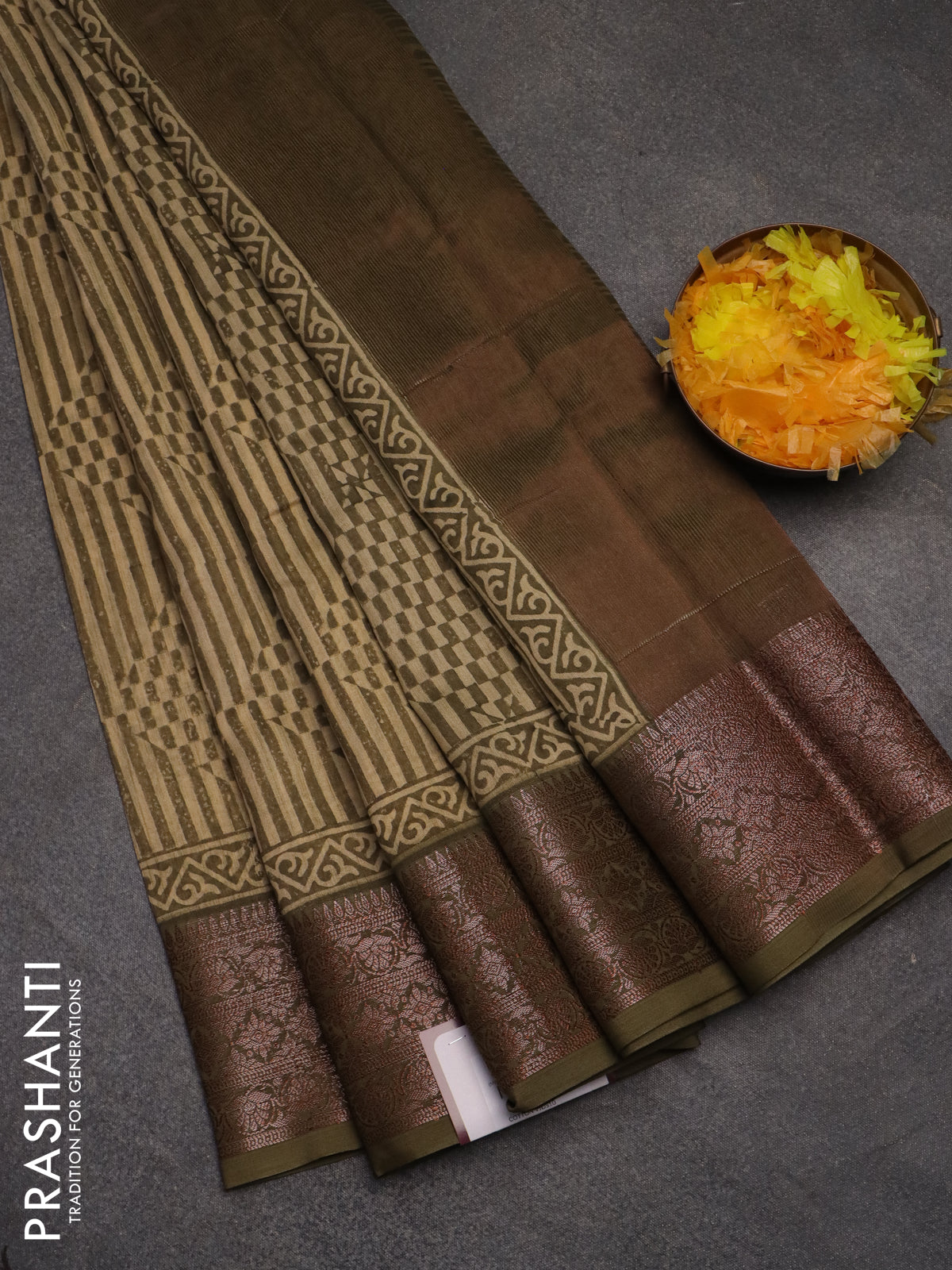 Chanderi silk cotton saree beige and mehendi green with allover prints and banarasi style border
