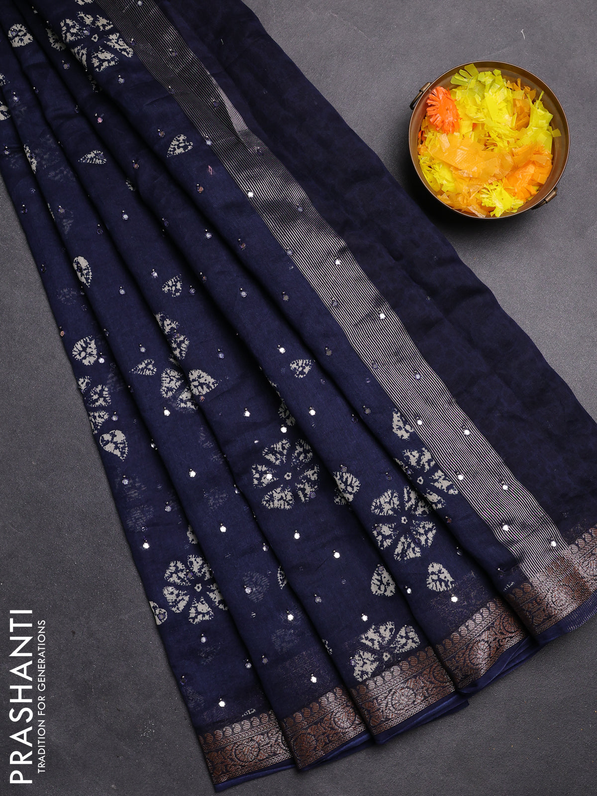 Chanderi silk cotton saree blue with butta prints & mirror work and zari woven border