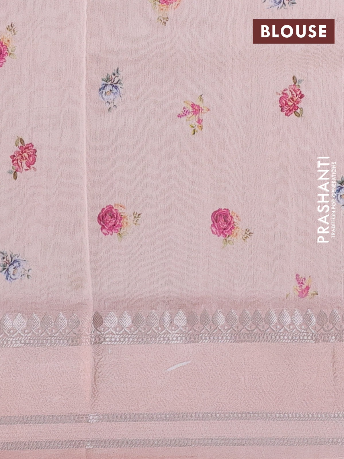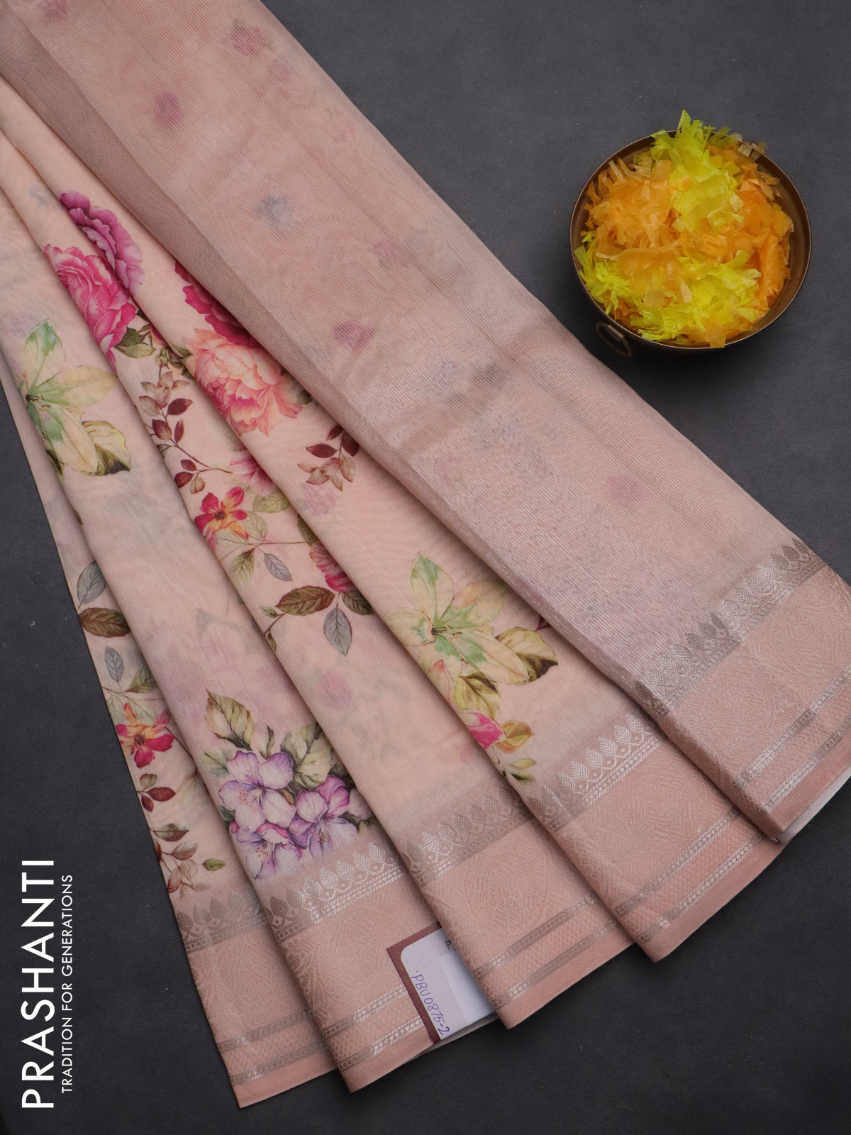 Chanderi silk cotton saree mild peach with allover floral digital prints and thread & zari woven border