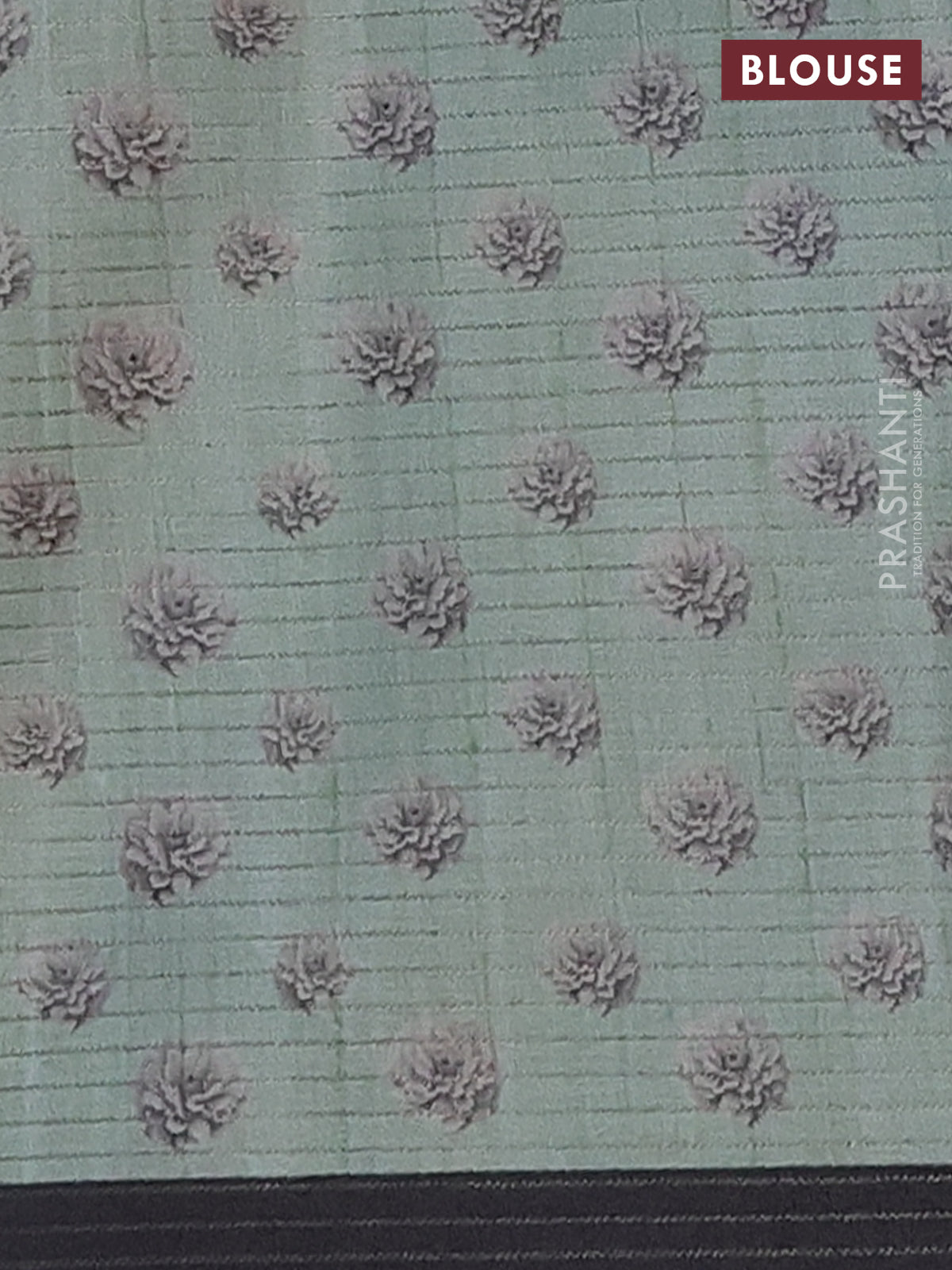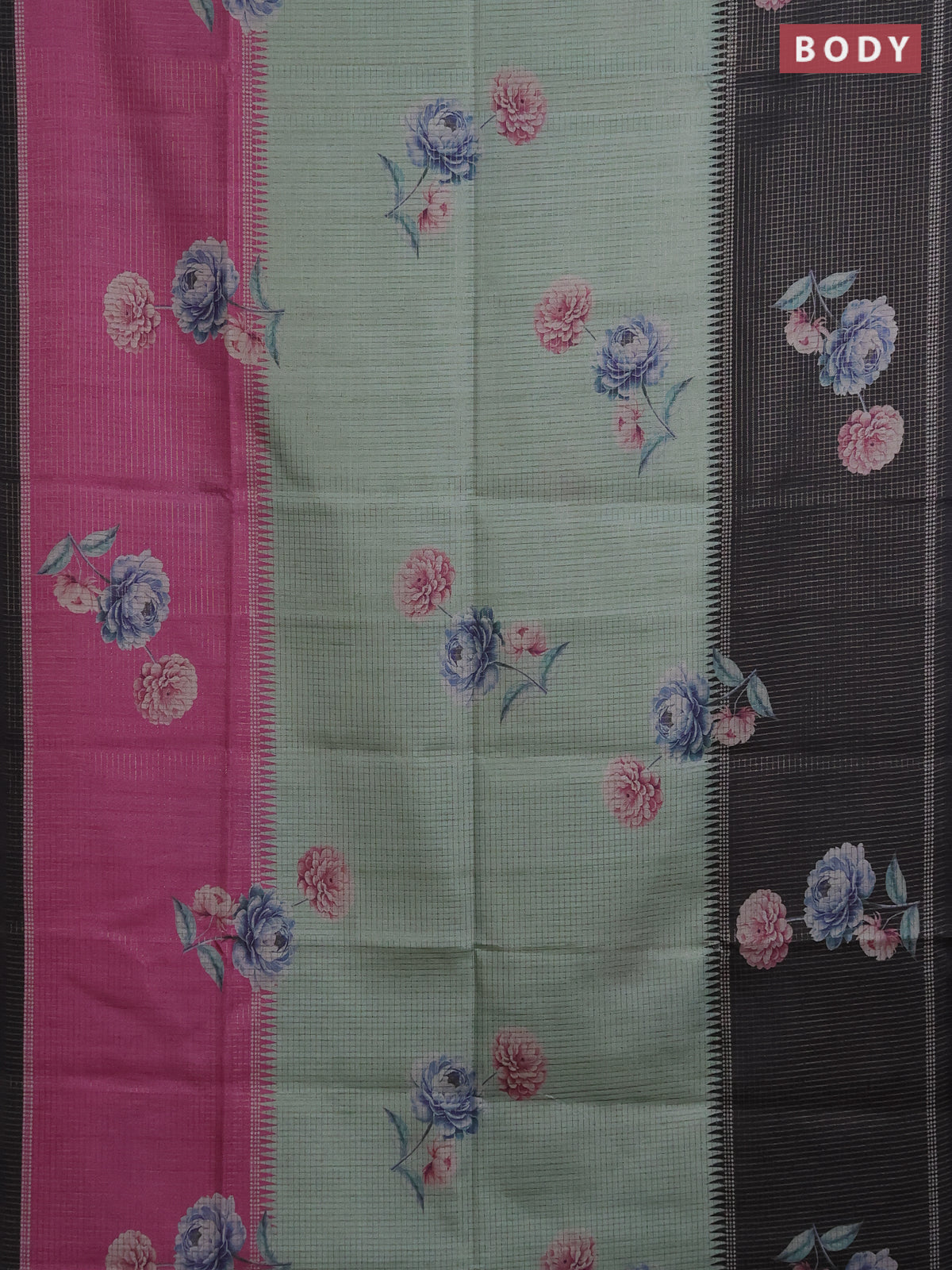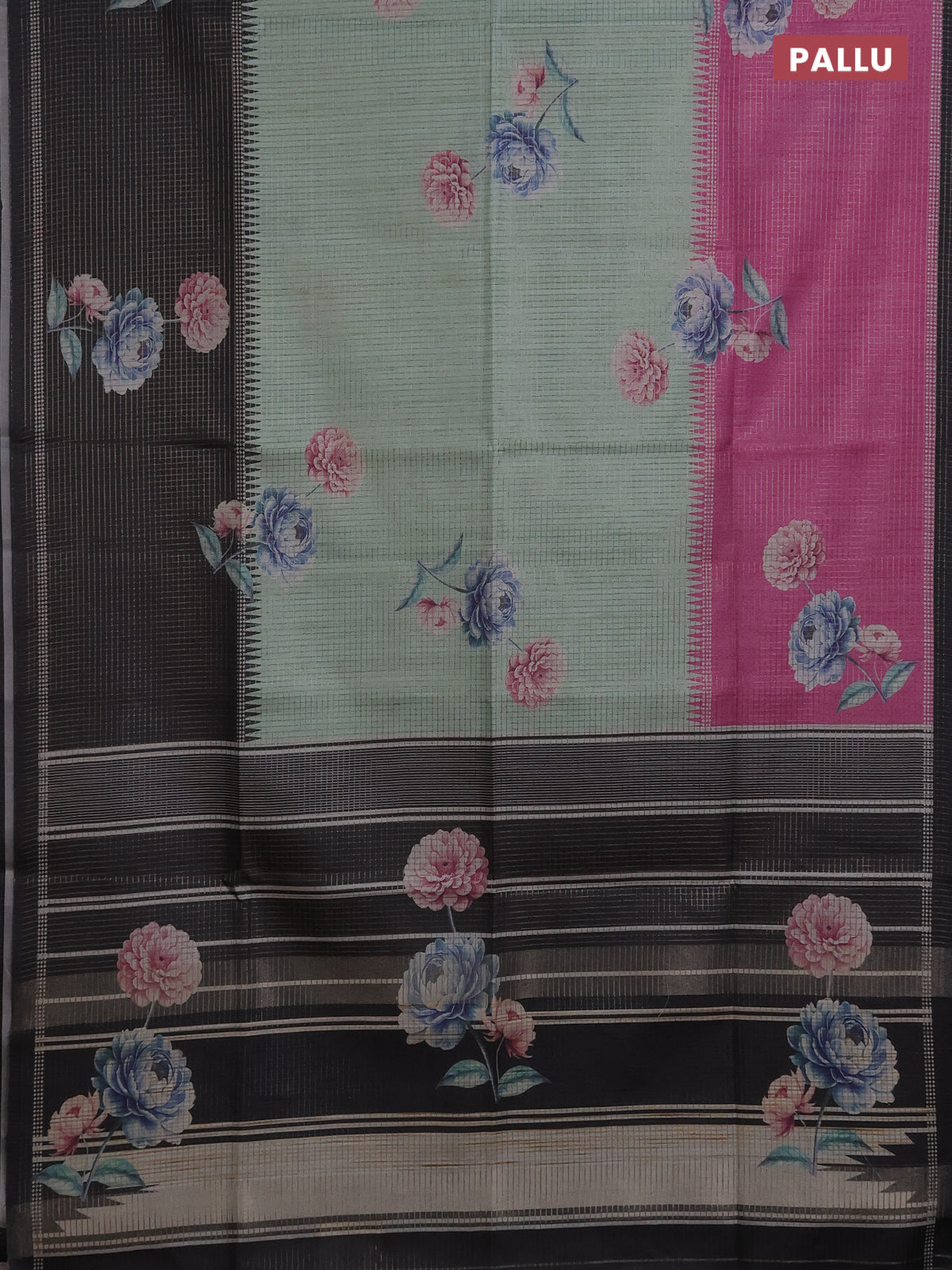 Chappa saree pastel green and black with allover small zari checked pattern & floral digital prints and ganga jamuna border