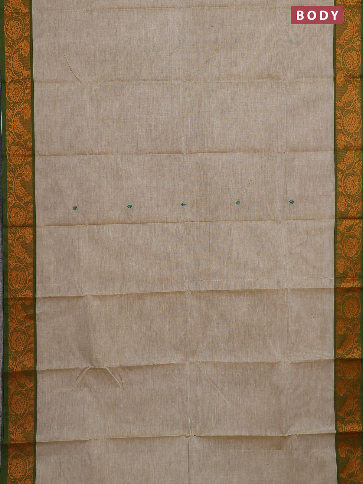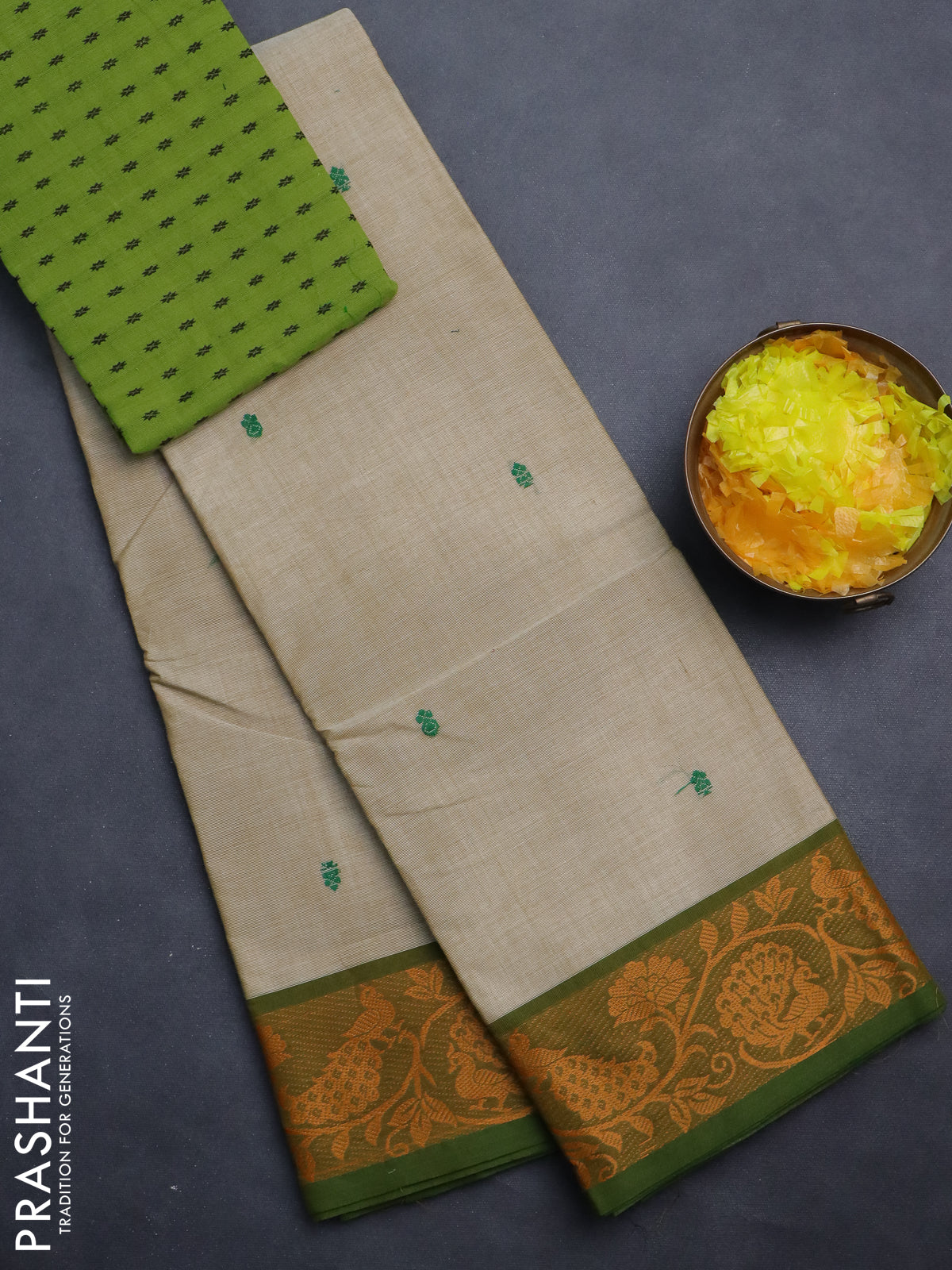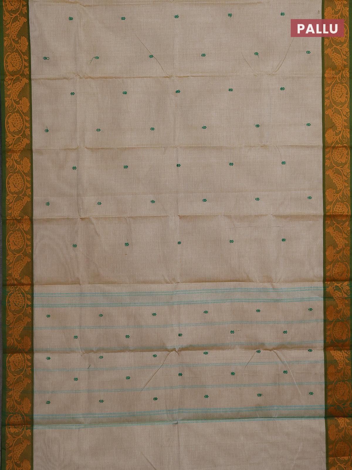 Chettinad cotton saree beige and green with thread woven buttas and thread woven border
