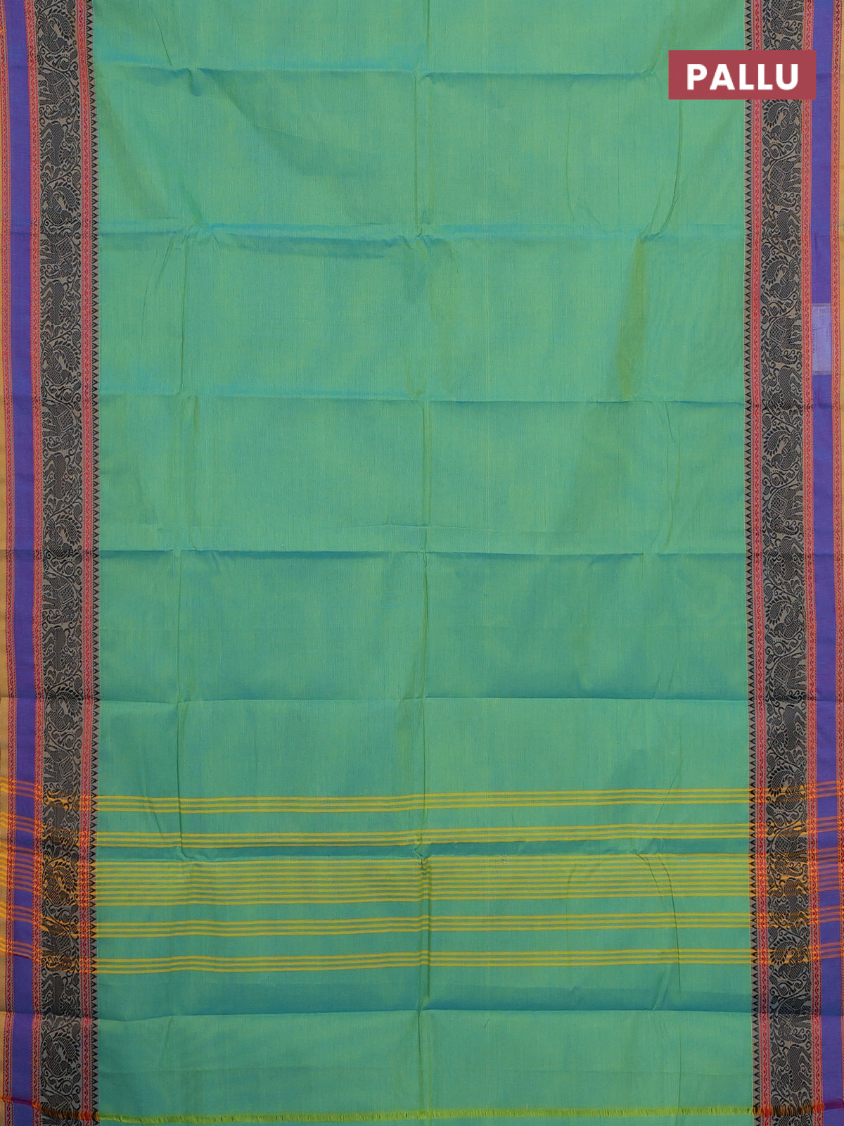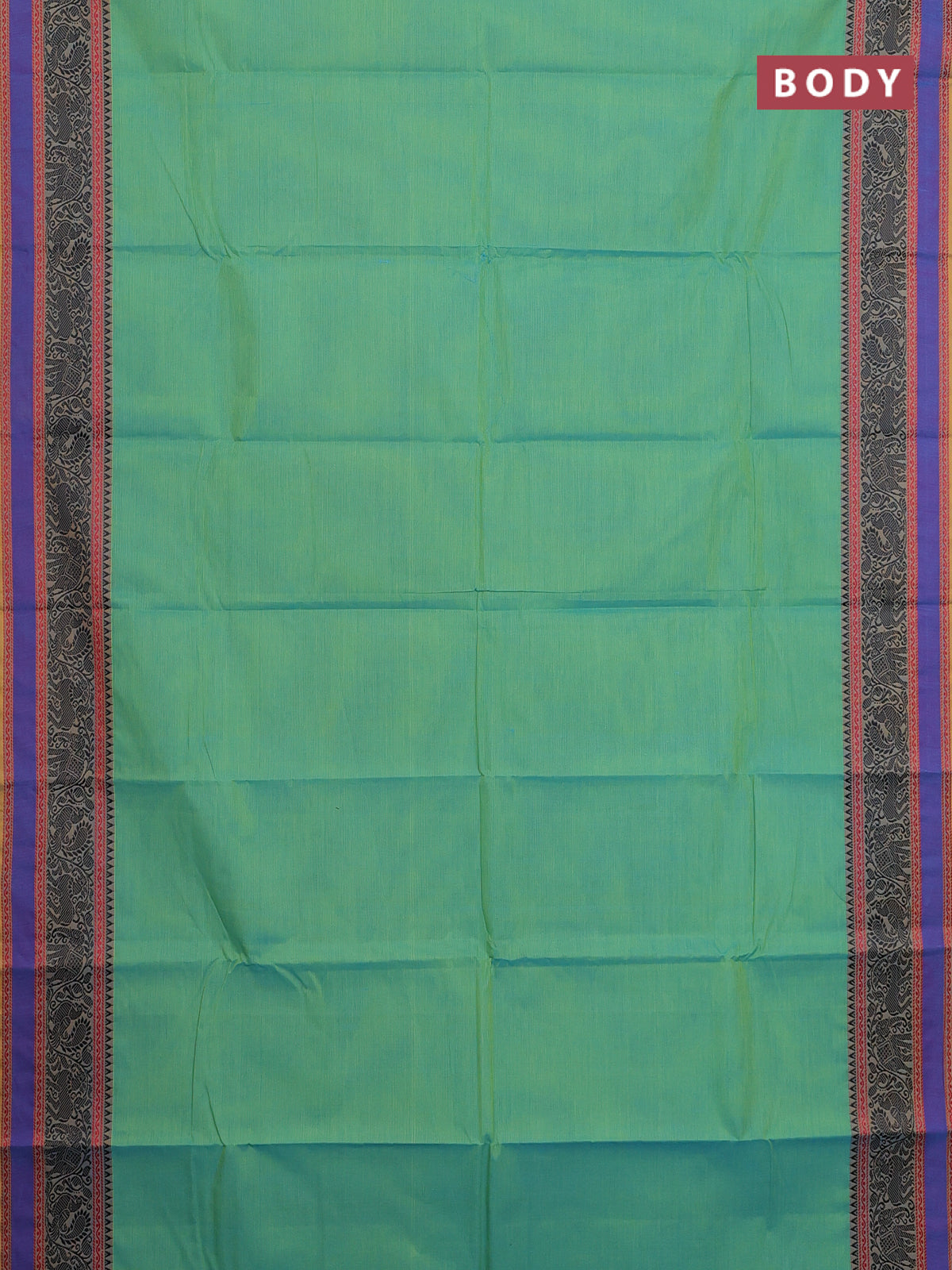 Chettinad cotton saree dual shade of green and blue with plain body and thread woven border