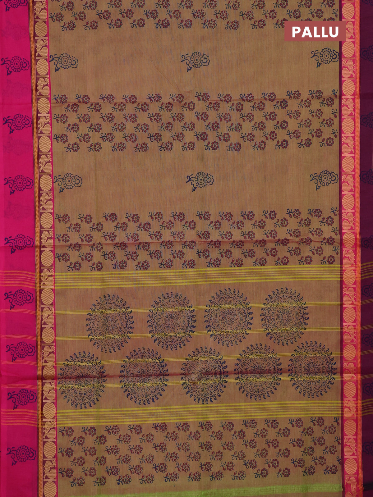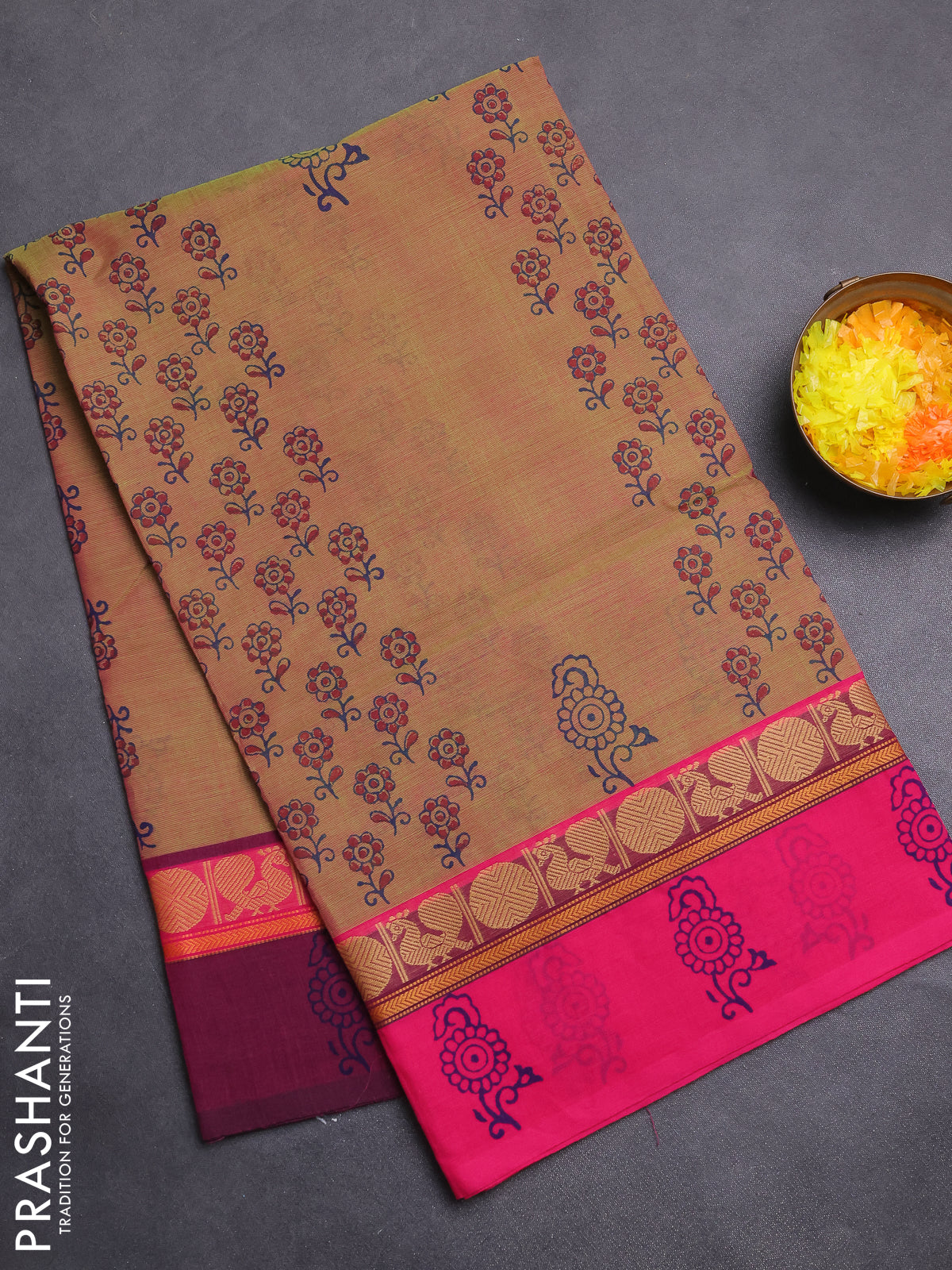 Chettinad cotton saree dual shade of green with allover block prints and ganga jamuna border