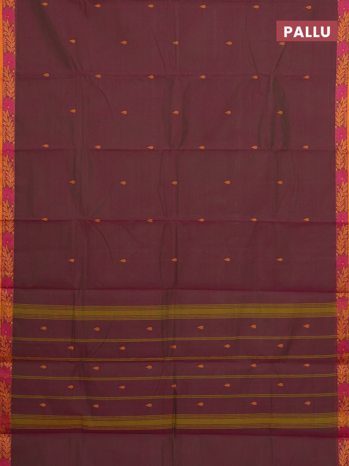Chettinad cotton saree dual shade of greenish magenta pink and dark mustard with thread woven buttas and thread woven border
