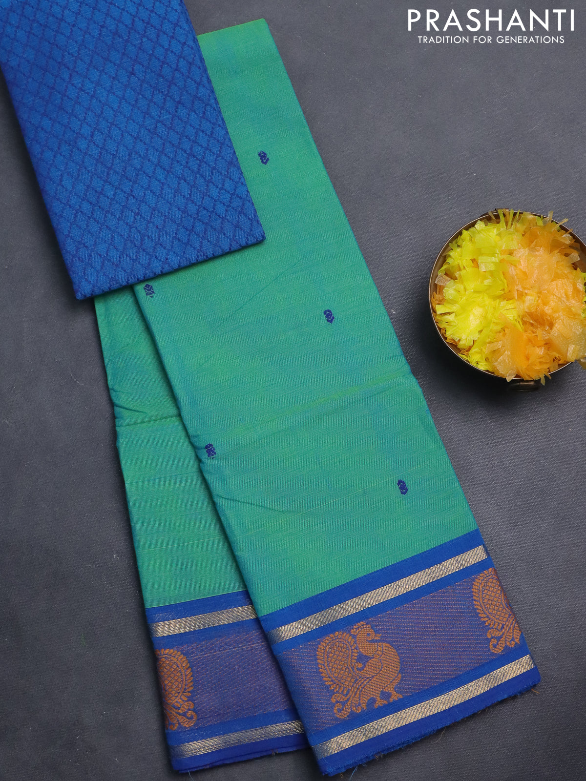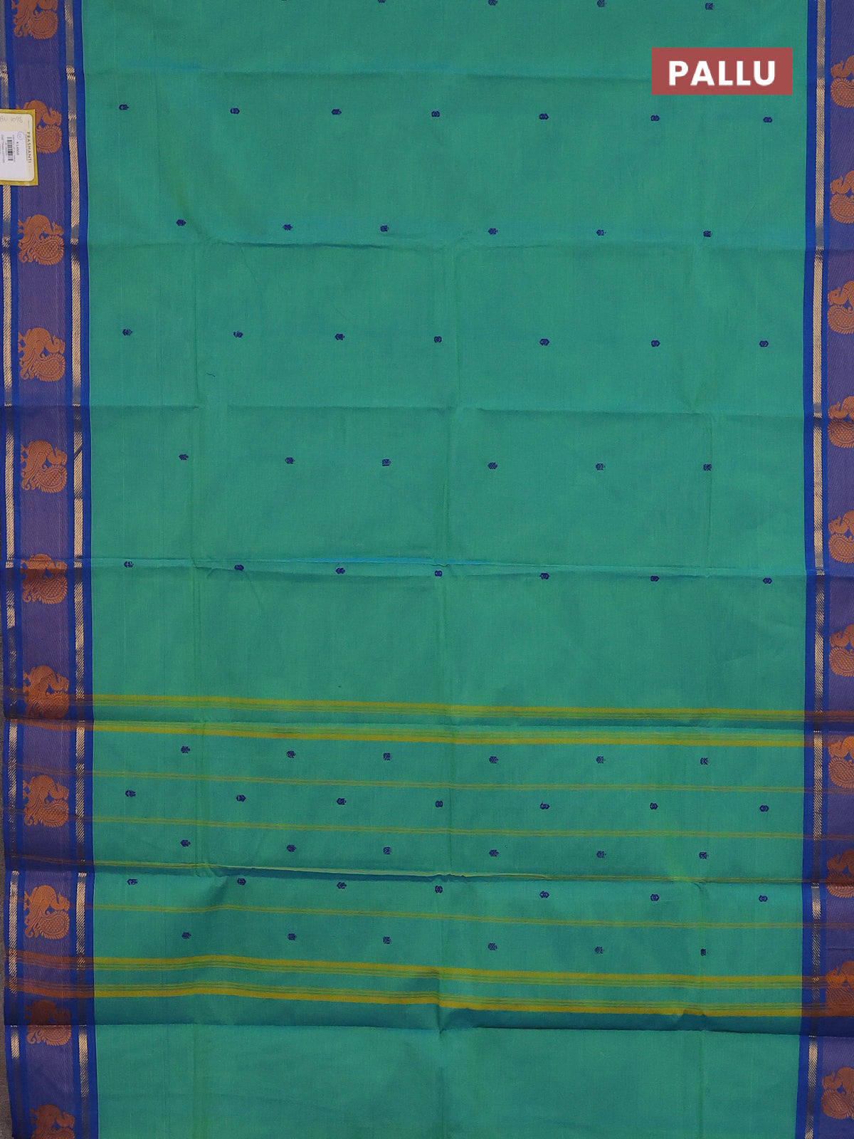 Chettinad cotton saree dual shade of teal green and cs blue with thread woven buttas and thread woven butta border