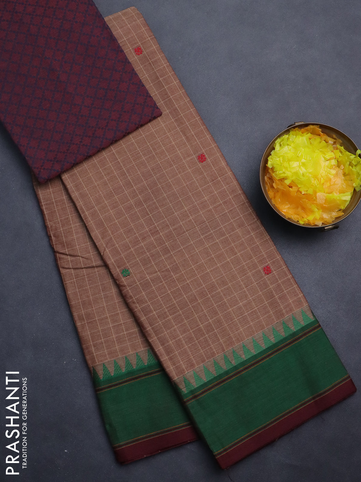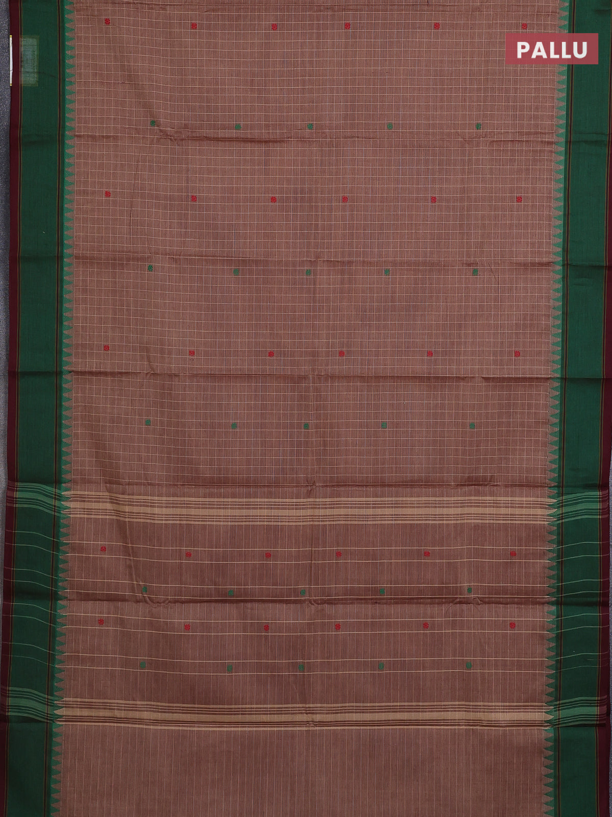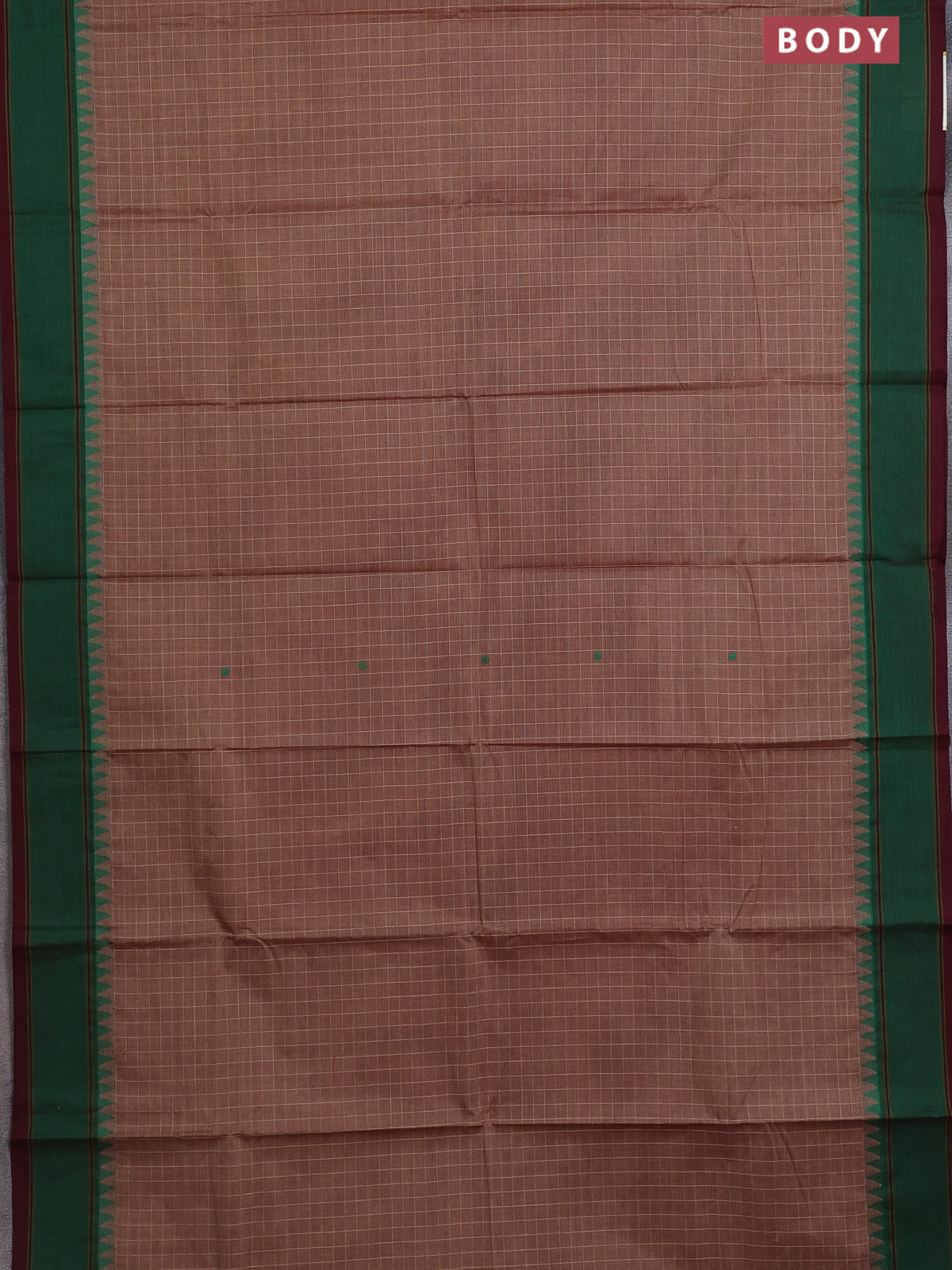 Chettinad cotton saree pastel brown and brown with allover checked pattern & thread woven buttas and temple design rettapet border