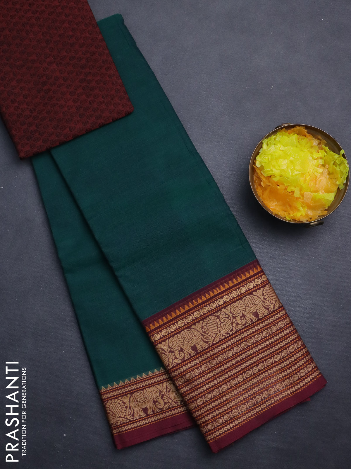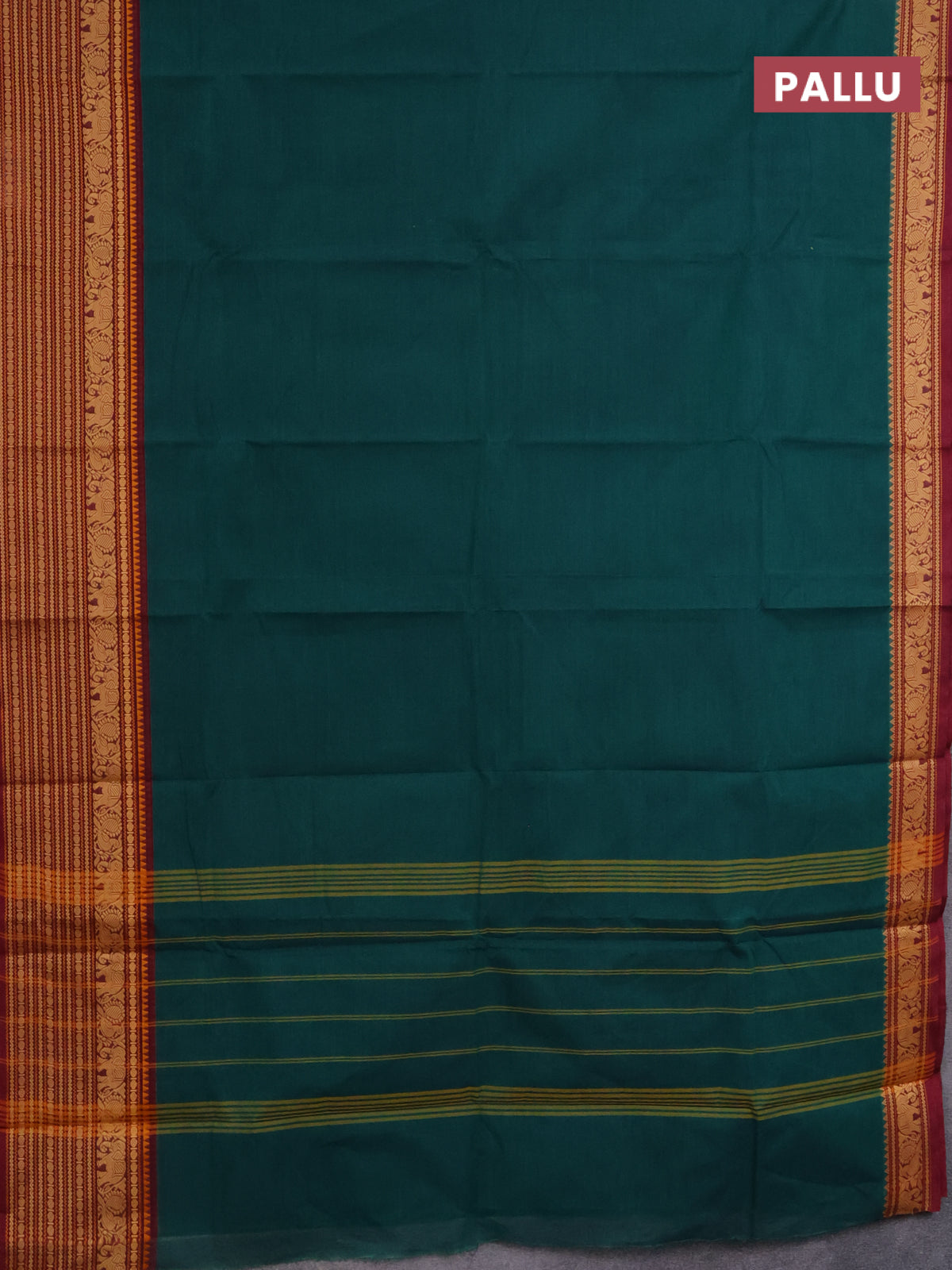 Chettinad cotton saree peacock green and maroon with palin body and long thread woven border