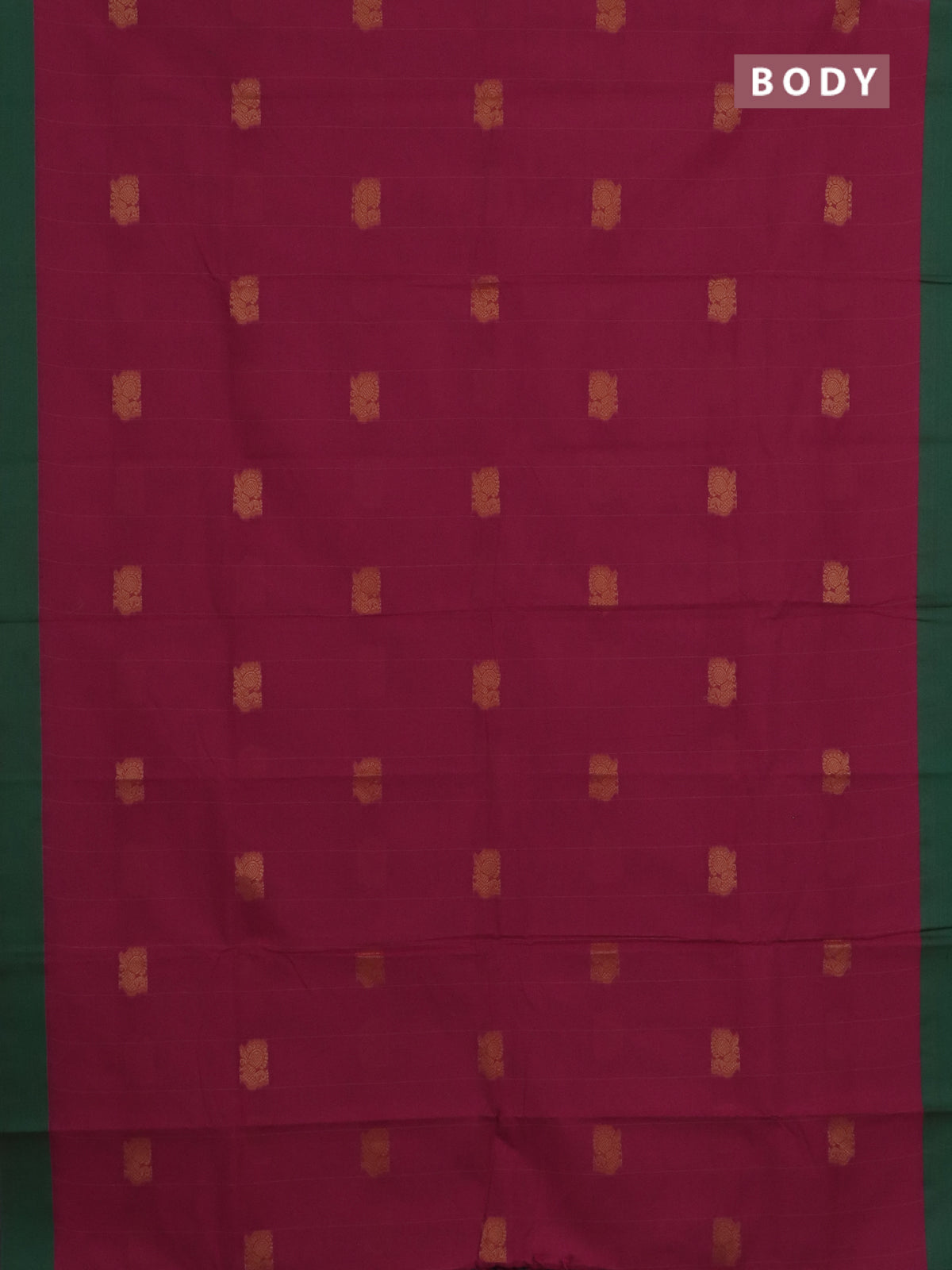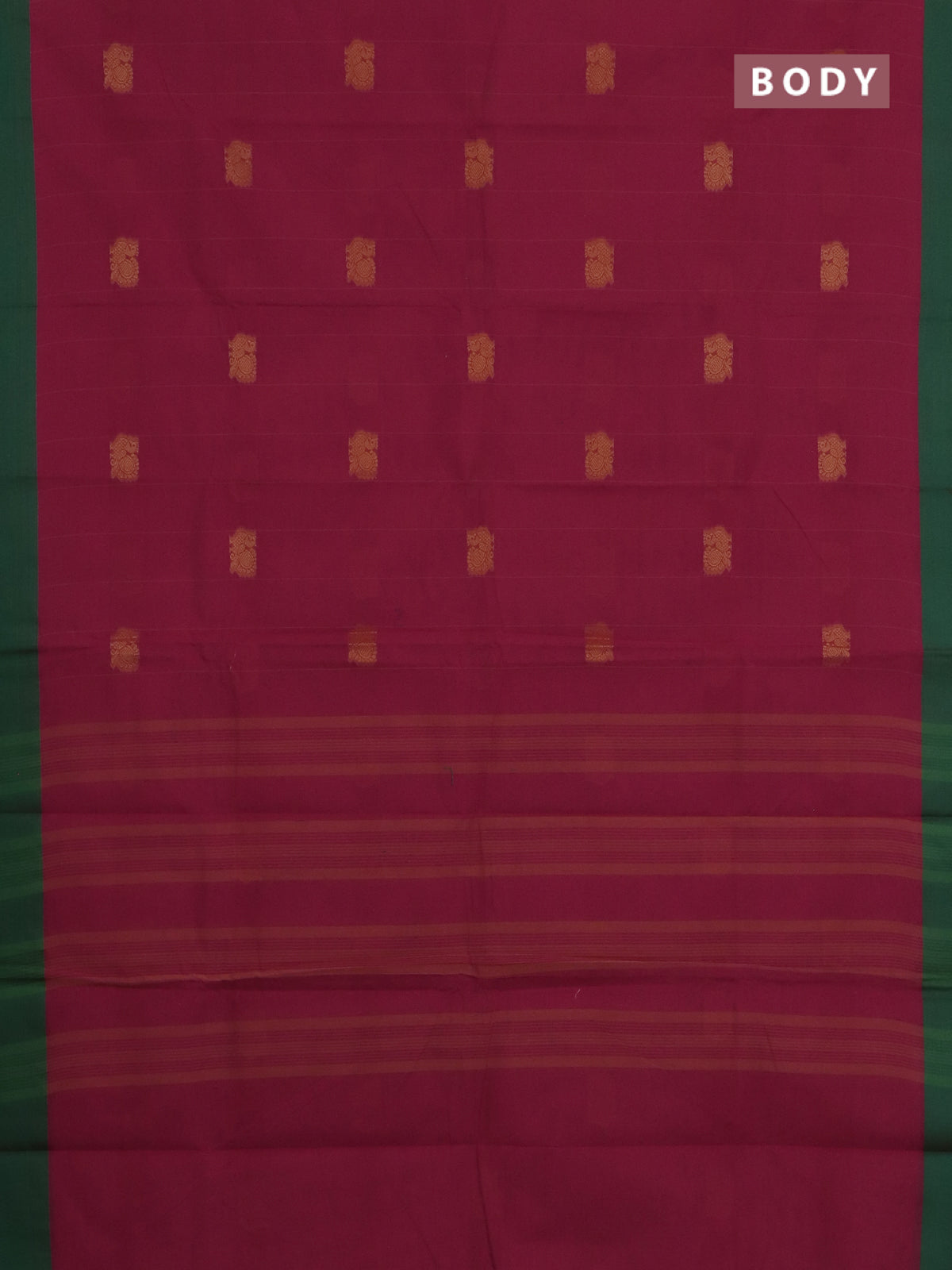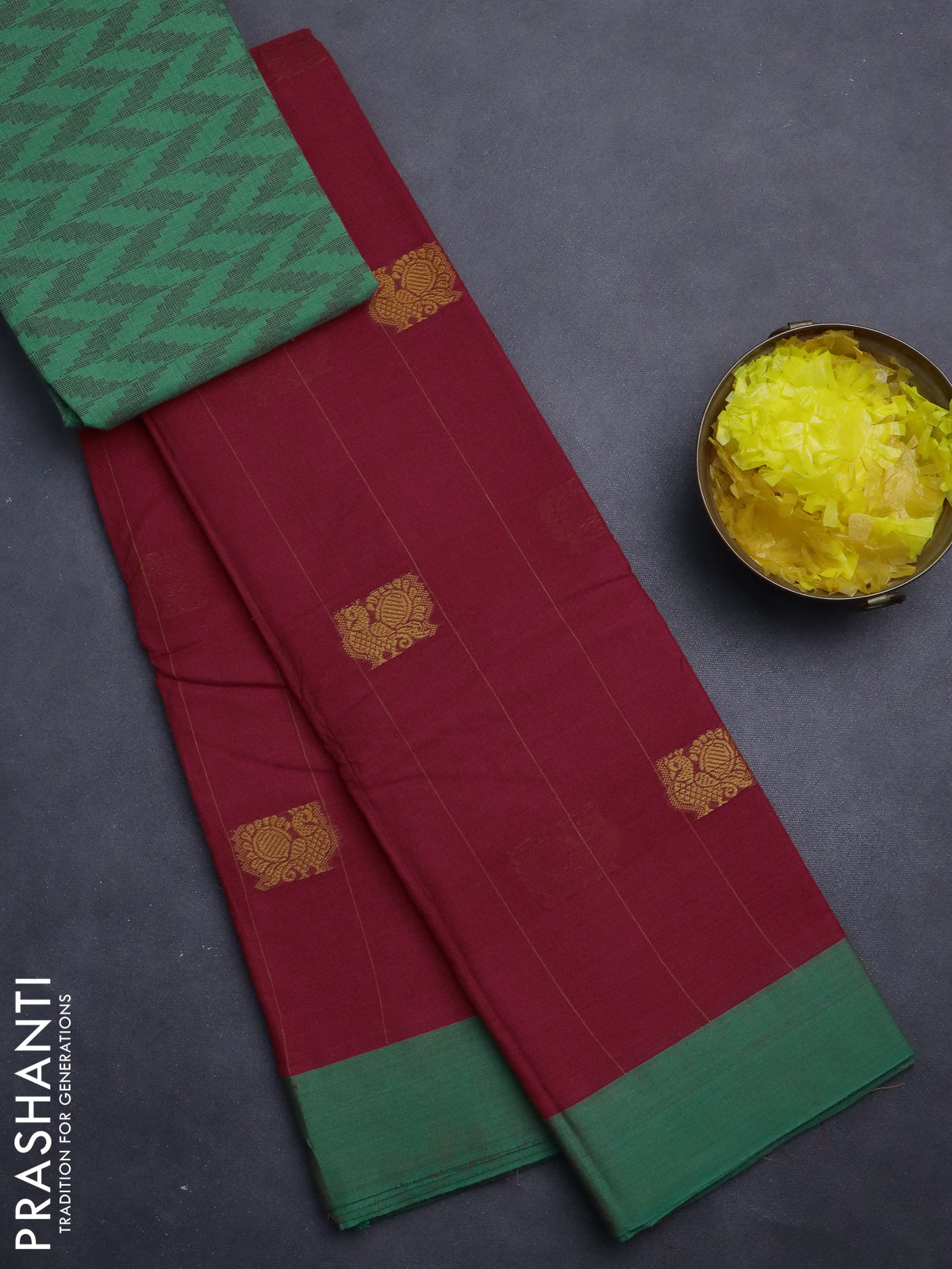Chettinad cotton saree red and green with allover stripe pattern & thread woven buttas and simple border