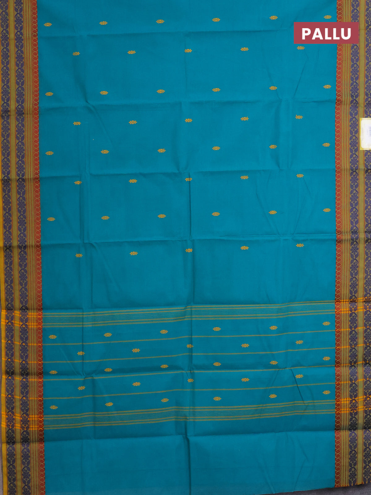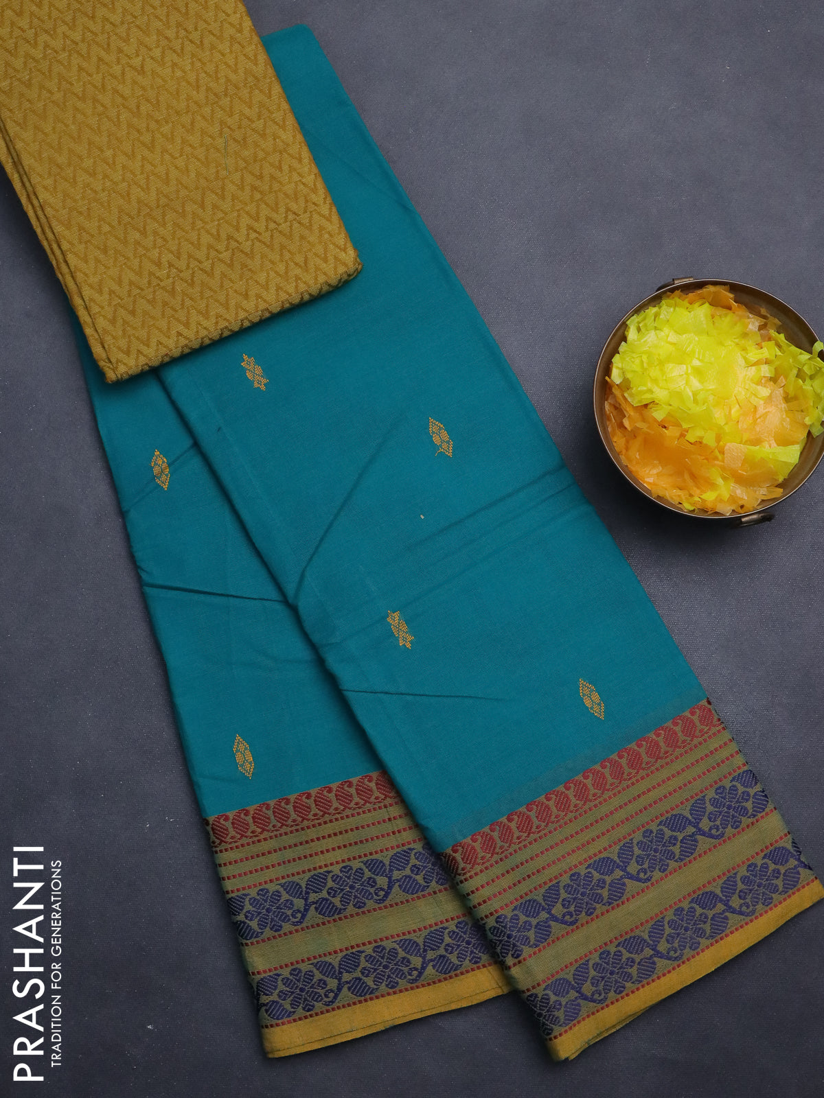Chettinad cotton saree teal green shade and mustard shade with thread woven buttas and thread woven border