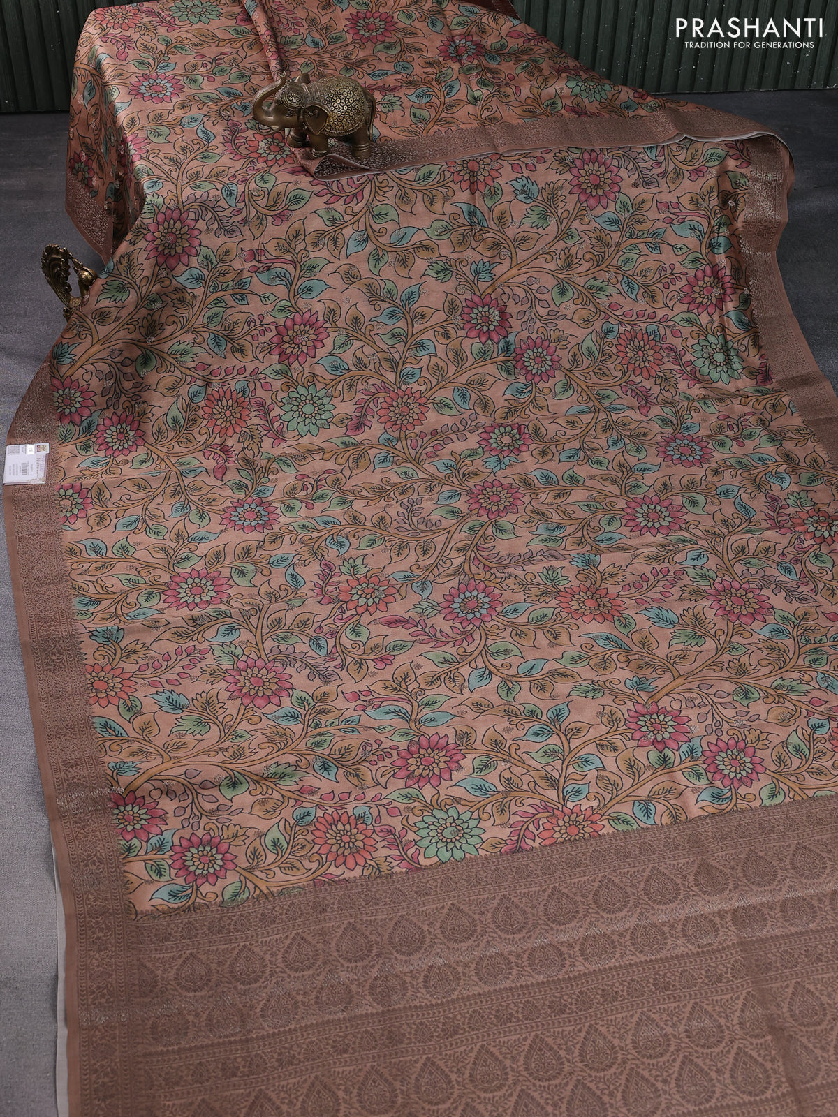 Chiniya silk saree brown with allover woven buttas & kalamkari digital prints and banarasi style border