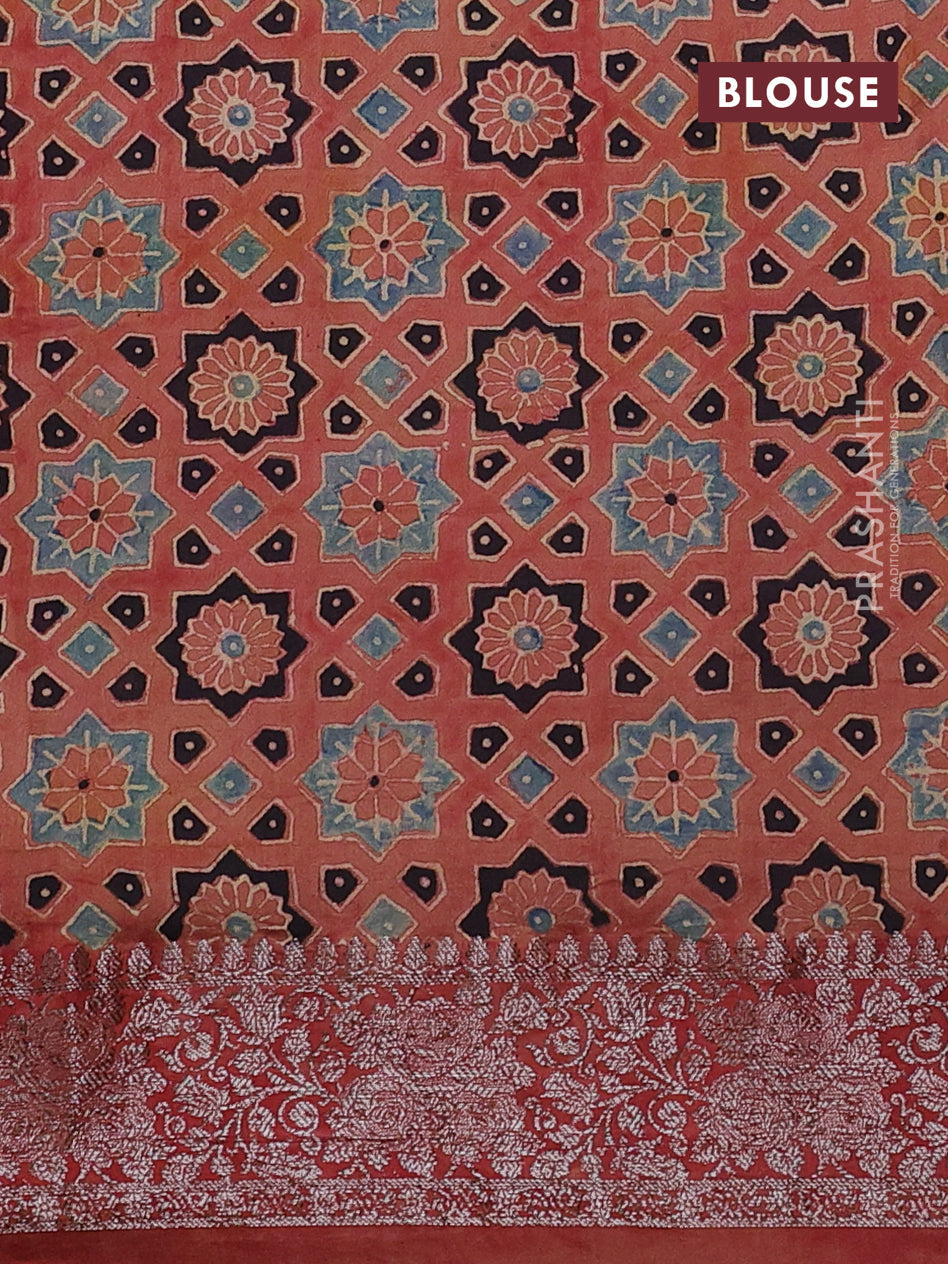 Material : Chiniya Silk SILK MARK CERTIFIED Blouse : Ajrakh printed blouse Length of saree : 6.2 mts (5.5 mts... Read more
