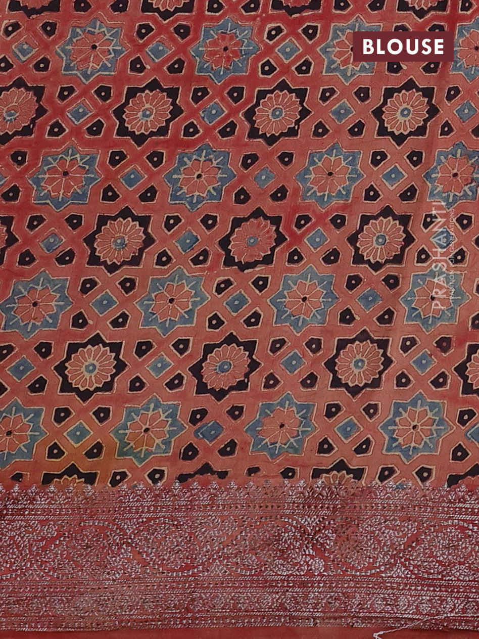 Material : Chiniya Silk SILK MARK CERTIFIED Blouse : Ajrakh printed blouse Length of saree : 6.2 mts (5.5 mts... Read more