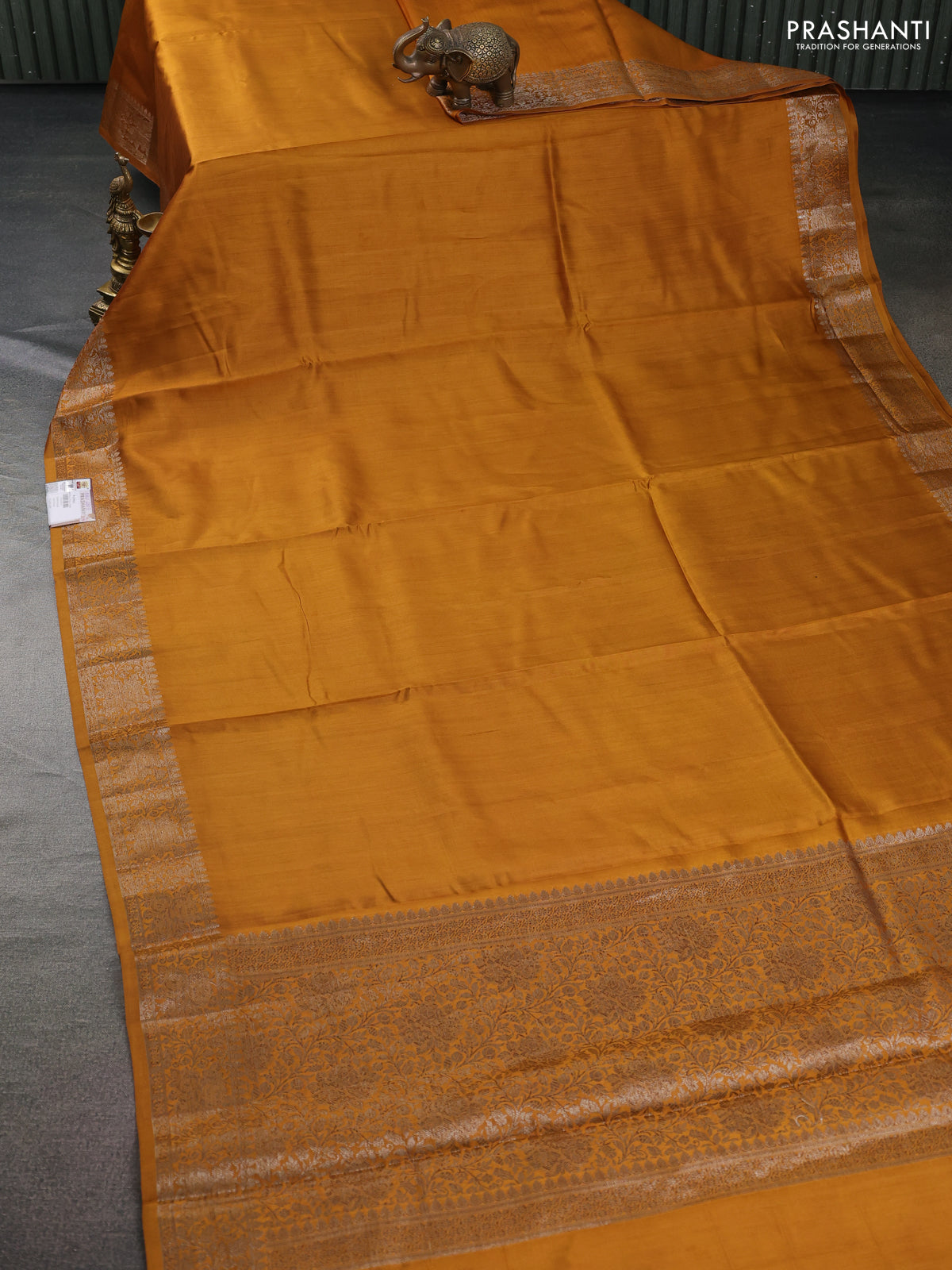 Chiniya silk saree dark mustard and rust shade with plain body and woven border