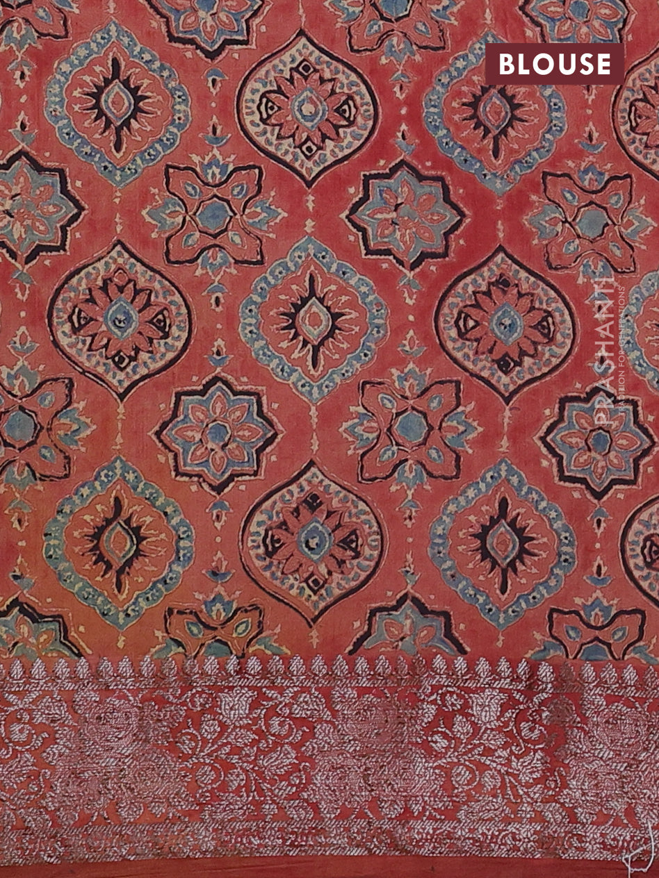 Material : Chiniya Silk SILK MARK CERTIFIED Blouse : Ajrakh printed blouse Length of saree : 6.2 mts (5.5 mts... Read more