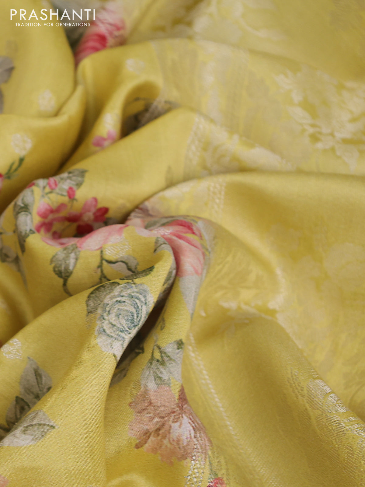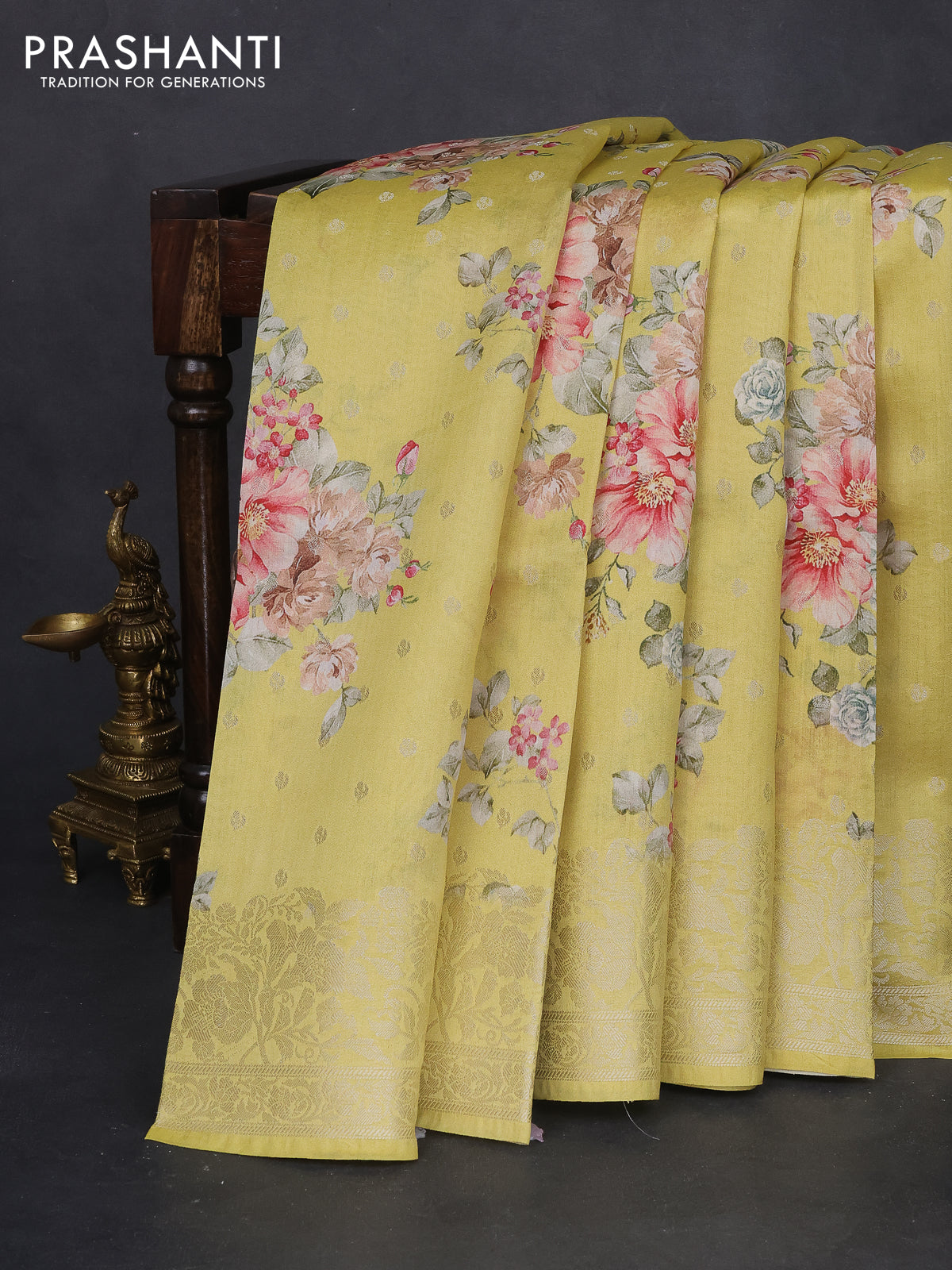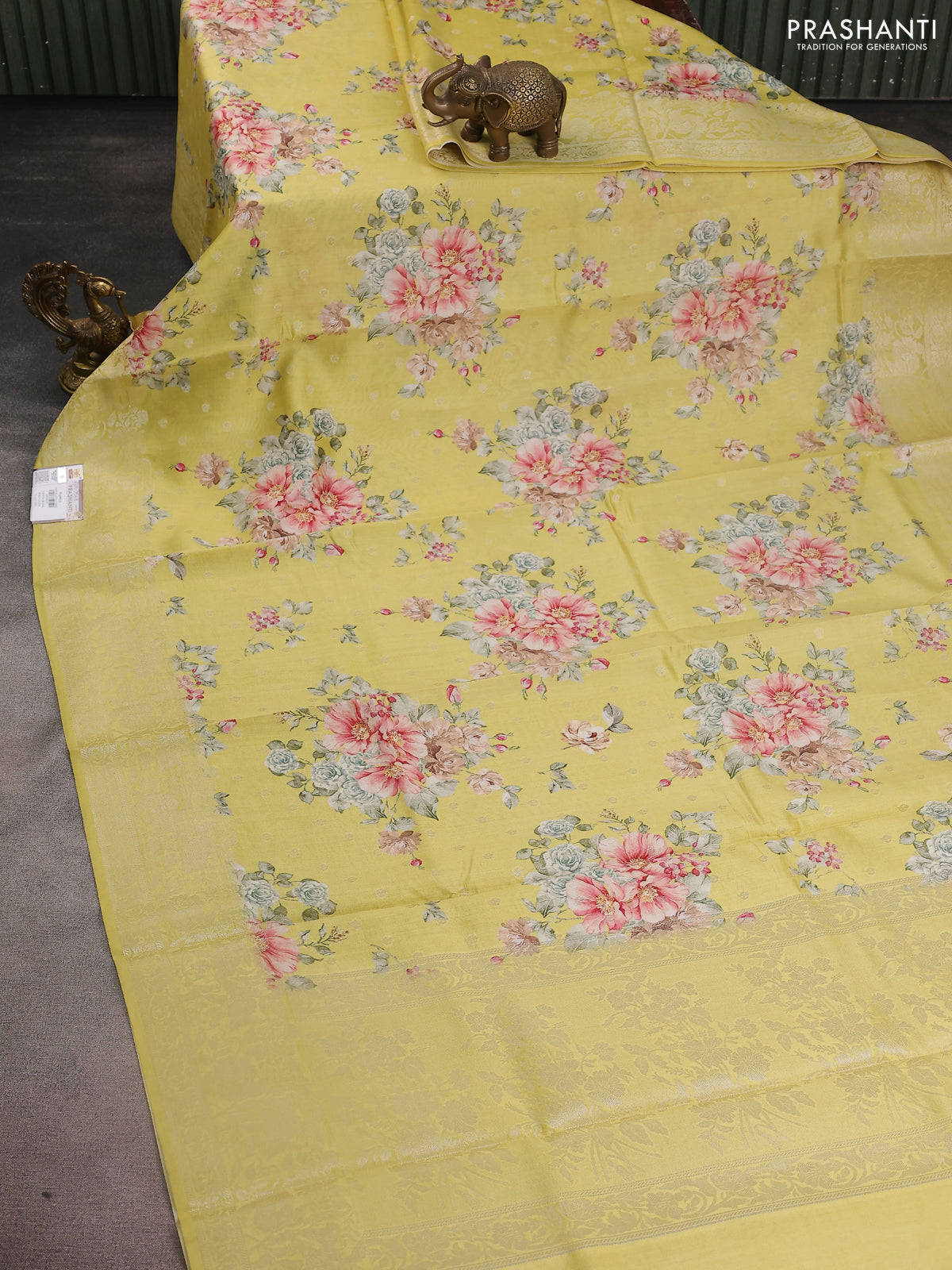 Chiniya silk saree lime yellow with allover silver zari buttas & floral digital prints and zari woven border