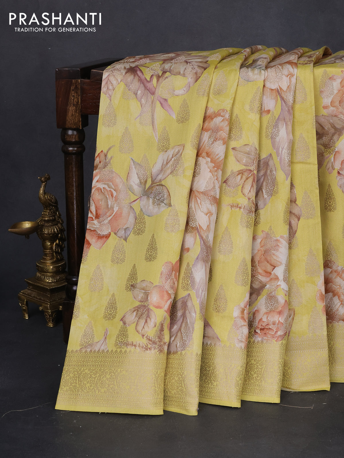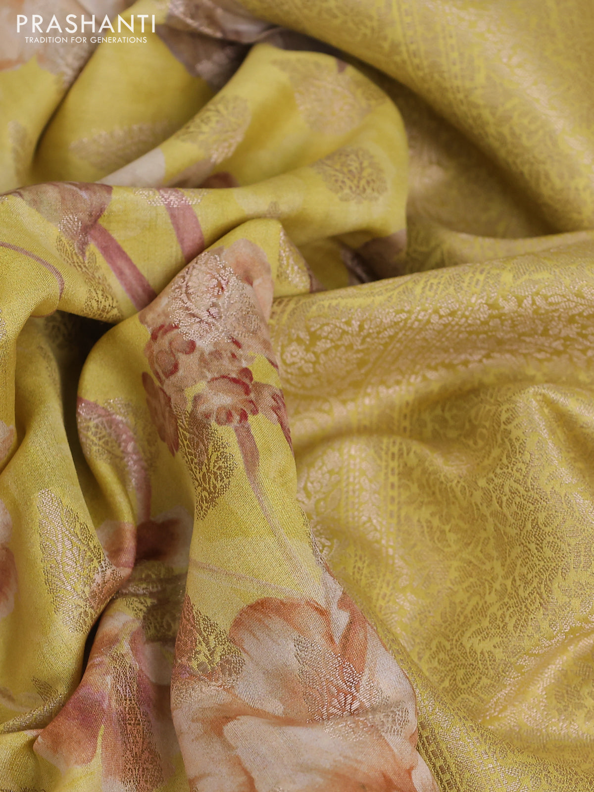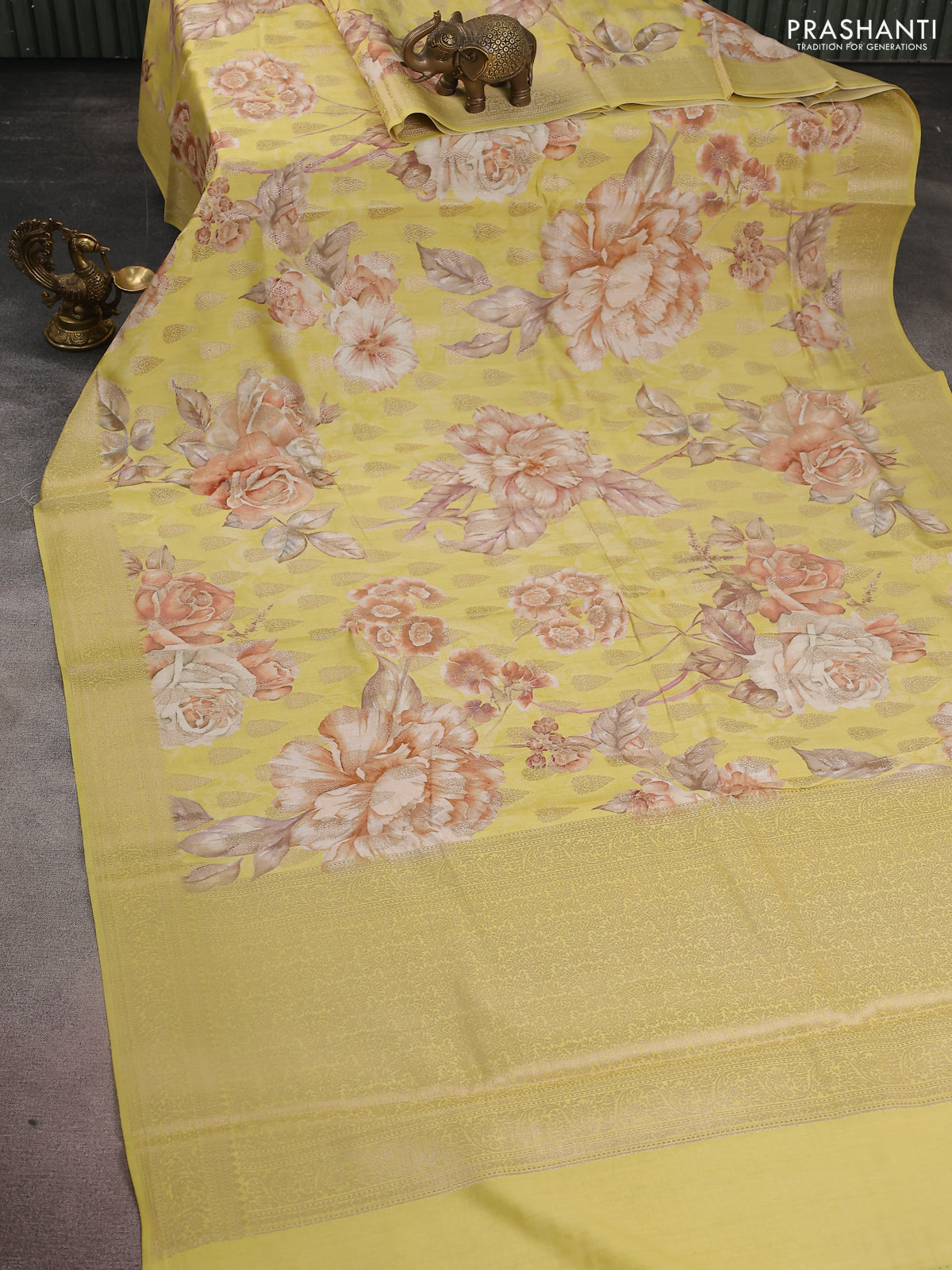 Chiniya silk saree lime yellow with allover zari buttas & floral digital prints and zari woven border