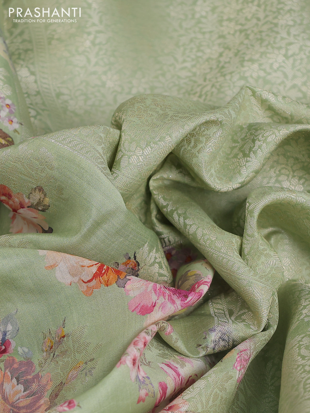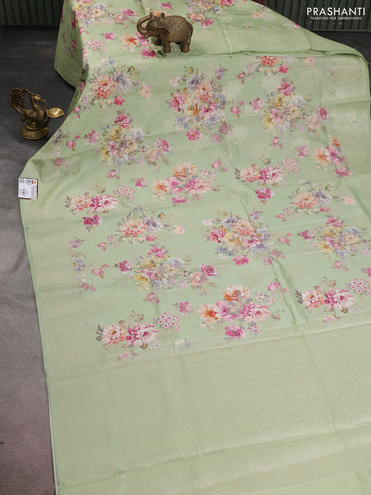 Chiniya silk saree pastel green with allover silver zari buttas & floral digital prints and zari woven border