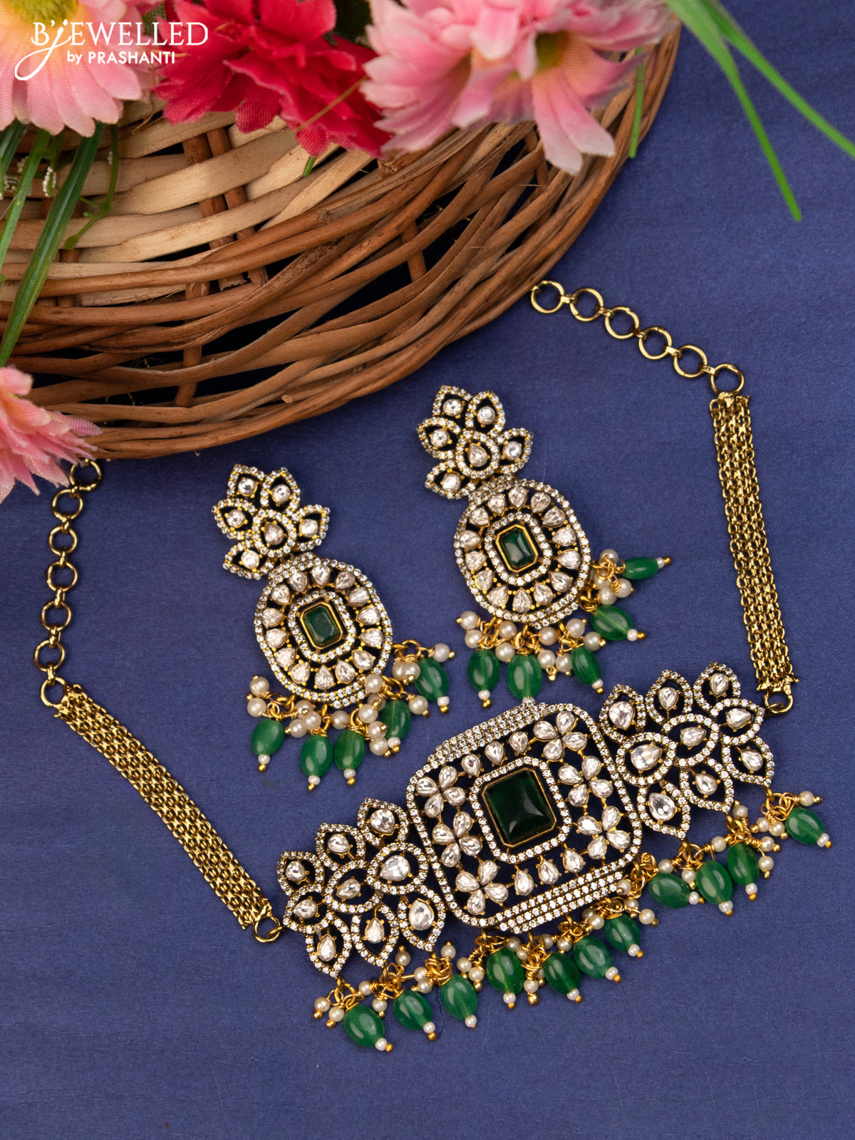 Choker with emerald & kundan stones and beads hanging in victorian finish