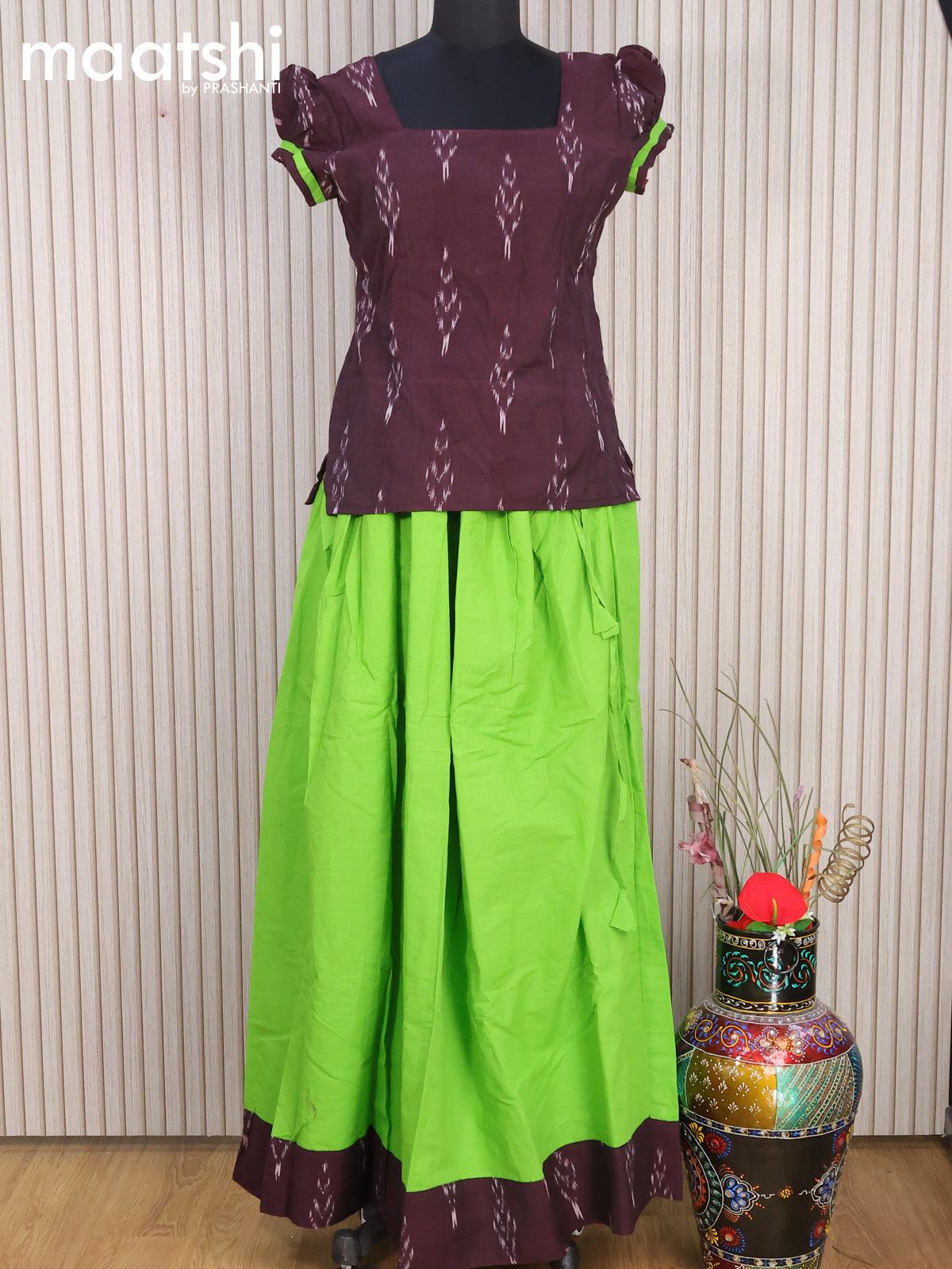 Cotton kids lehanga deep maroon and light green with allover ikat weaves and back knot for 16 years