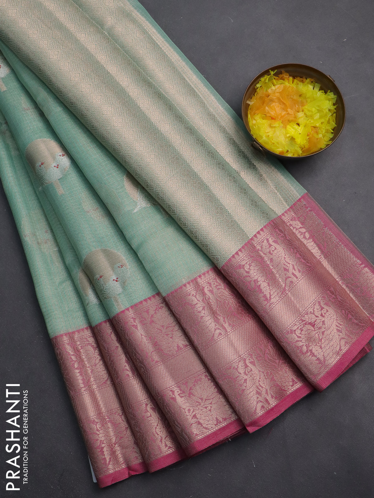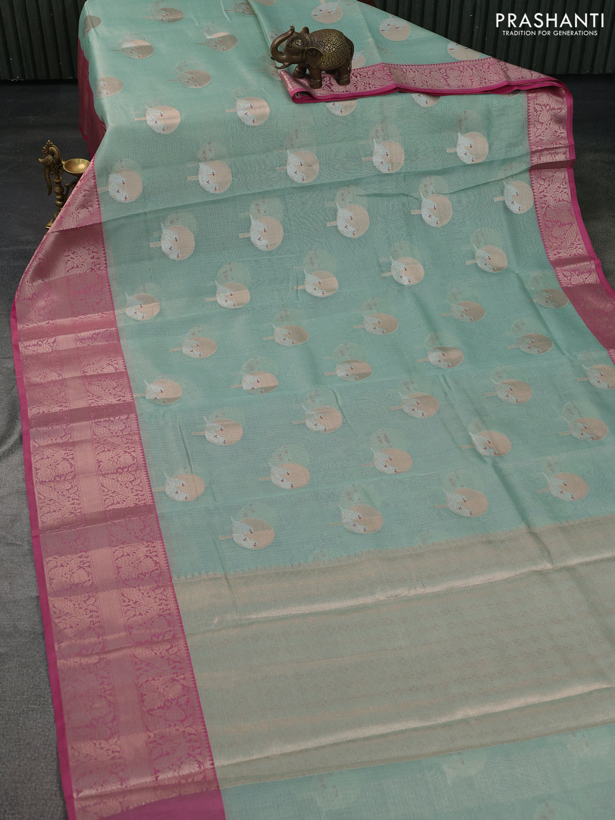 Cotton tissue zari kota saree teal green and pink with zari woven buttas and zari woven border