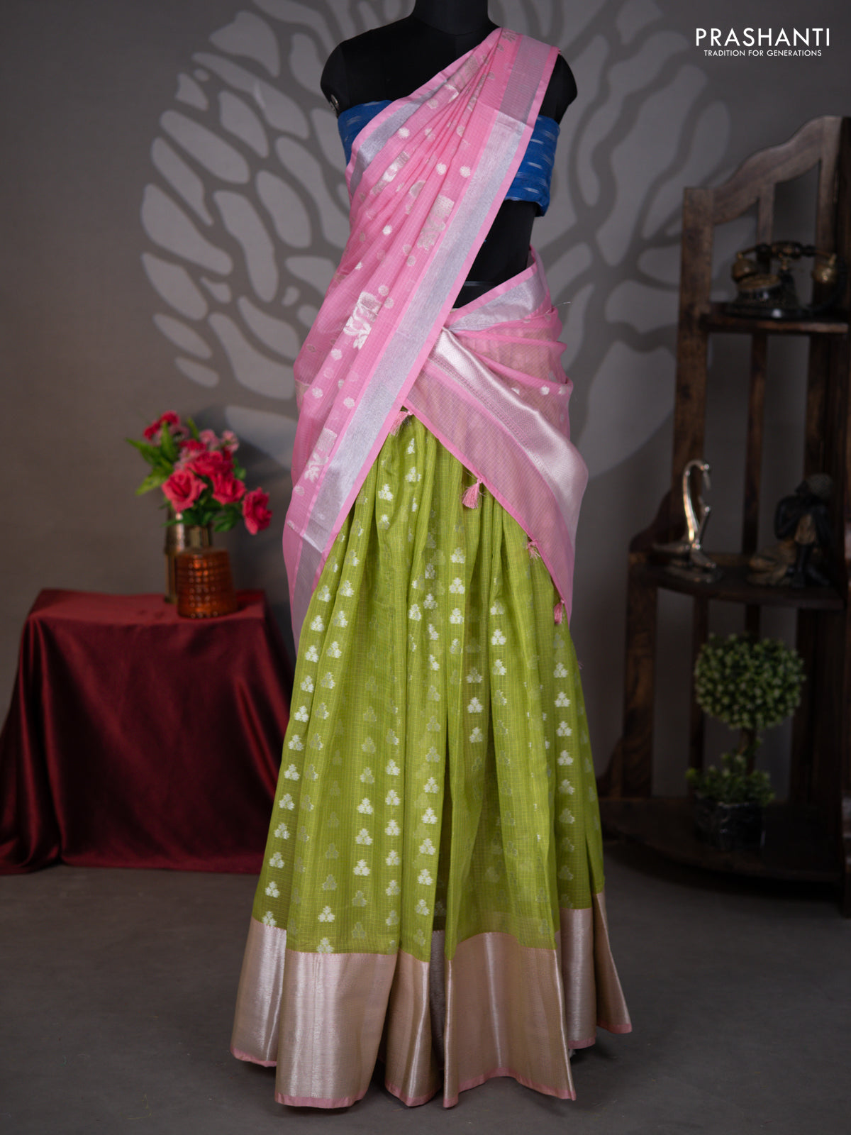 Cotton Zari Kota lehengas crafted with a fine airy weave and gentle glow, designed for those who love heritage beauty with a touch of everyday elegance. Curated by Prashanti for comfort and refined style.