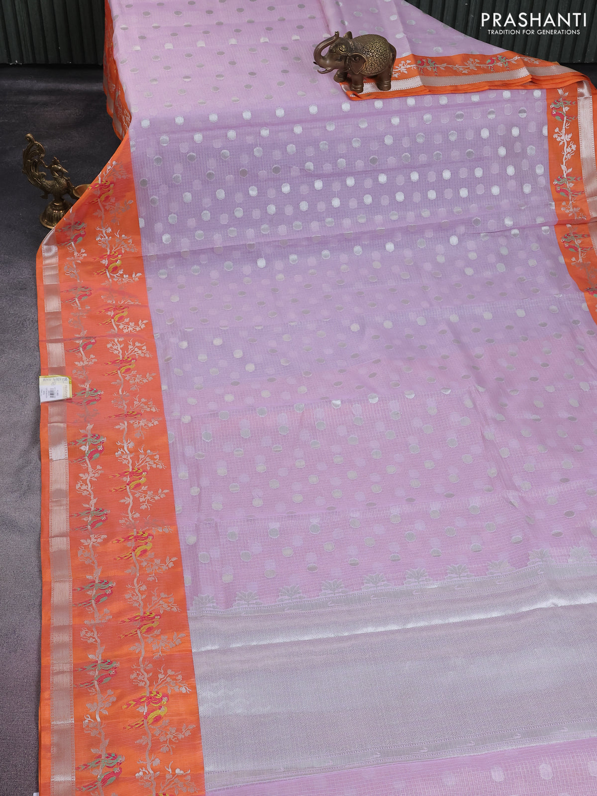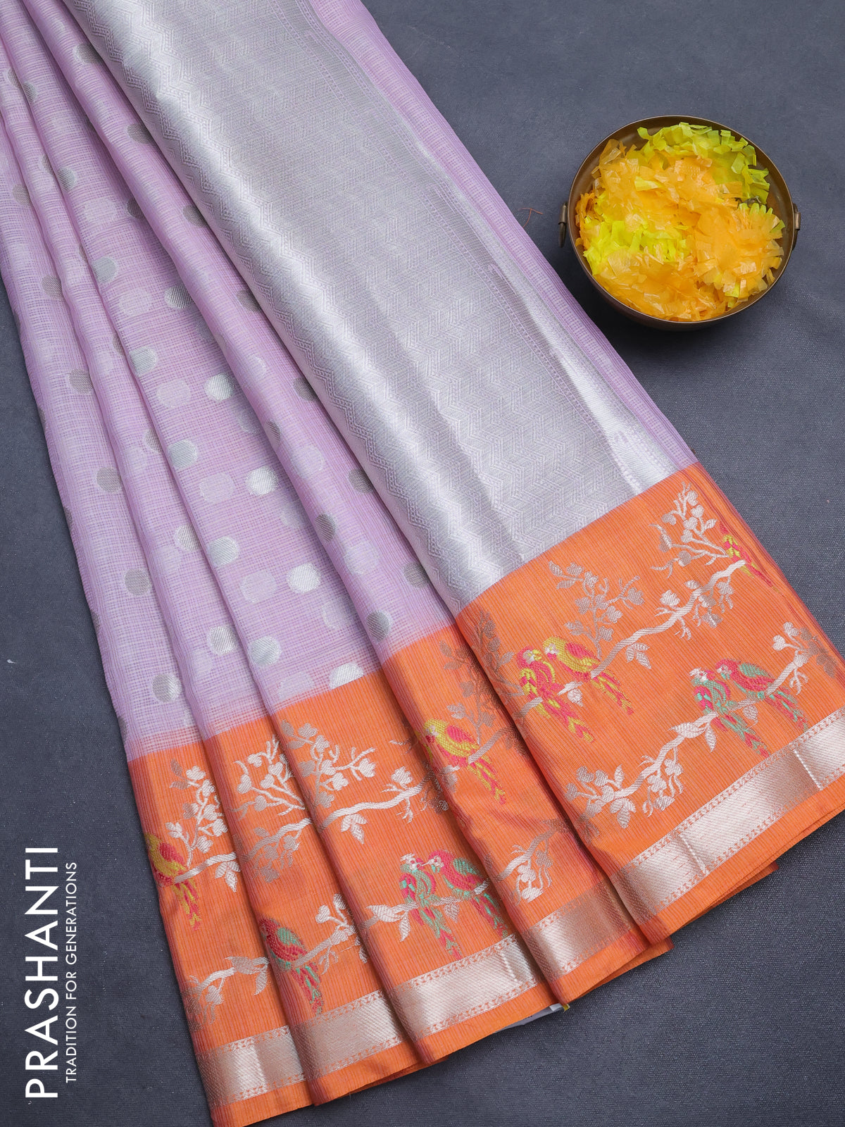 Cotton zari kota saree lavender and orange with silver zari woven buttas and thread & silver zari woven border