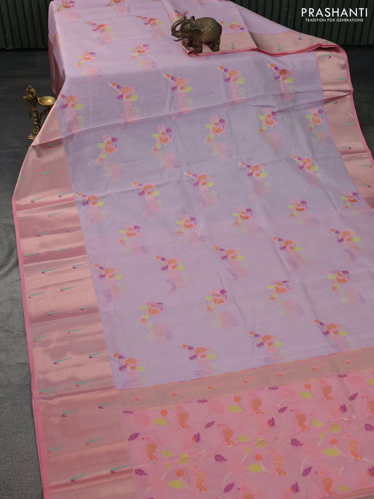 Cotton zari kota saree lavender and peach pink with thread woven buttas and muniya butta border