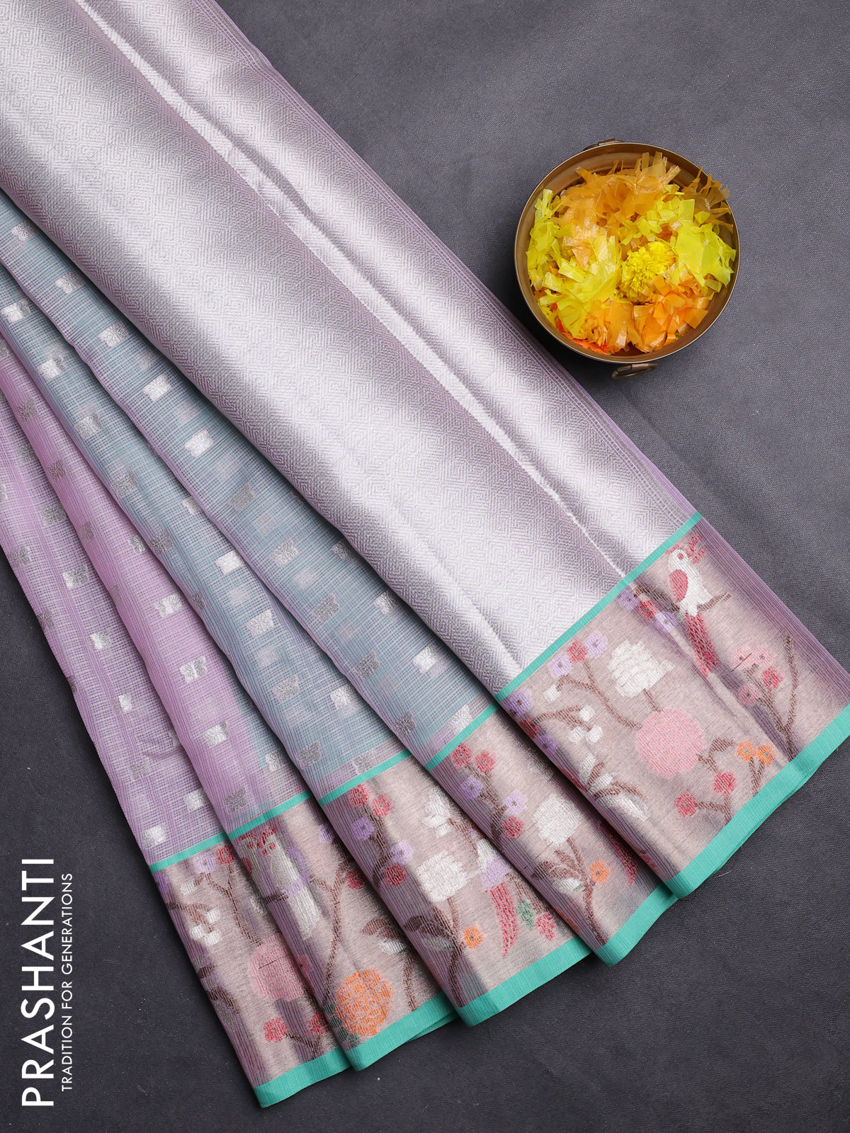 Cotton zari kota saree lavender and teal green with allover silver zari woven buttas and zari woven paithani border