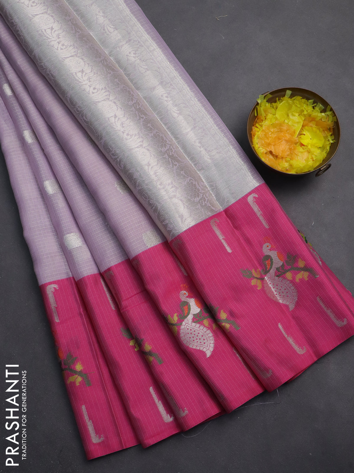 Cotton zari kota saree lavender shade and pink with silver zari woven buttas and peacock design woven border
