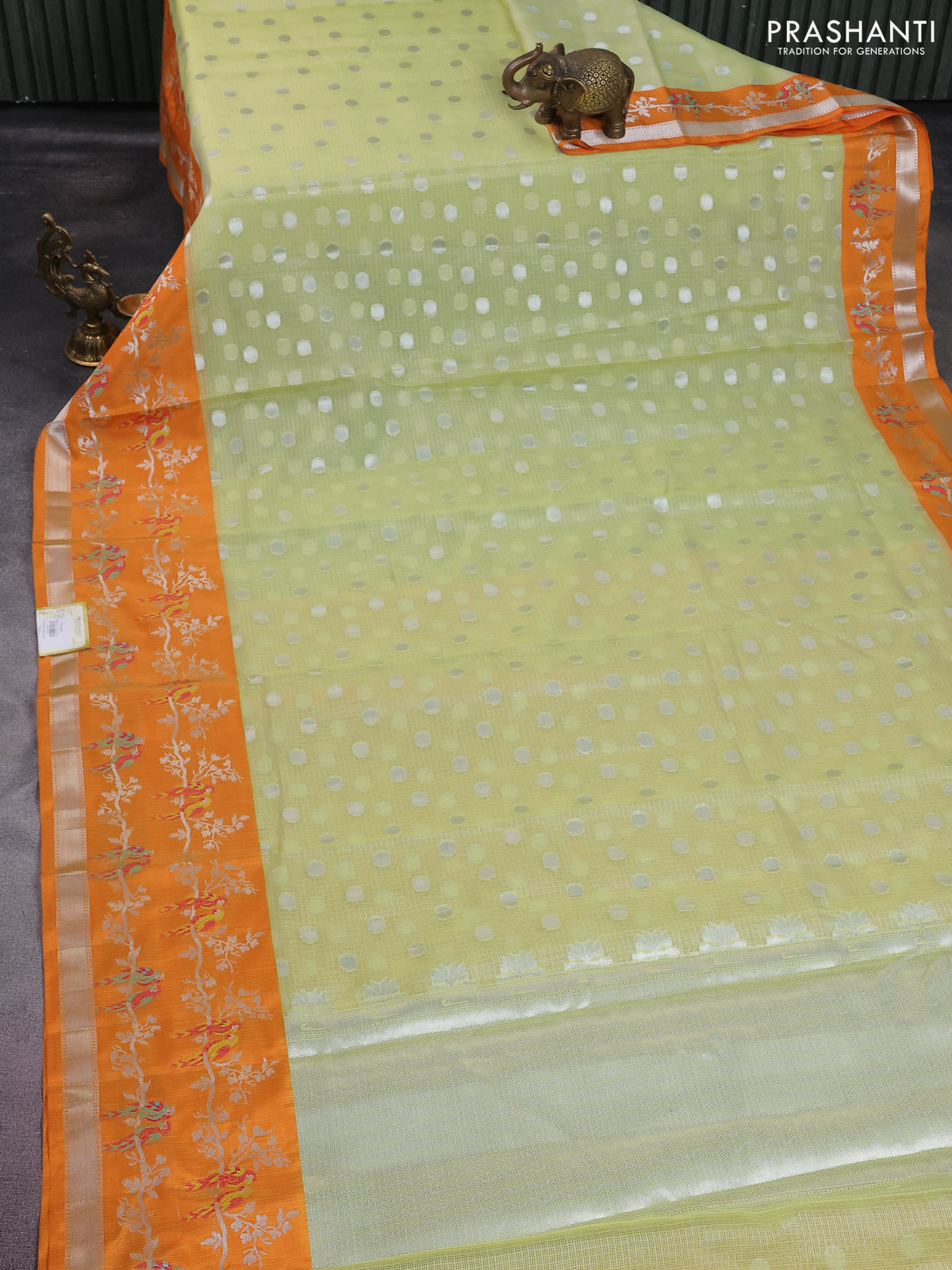 Cotton zari kota saree lime green and orange with silver zari woven buttas and thread & silver zari woven border