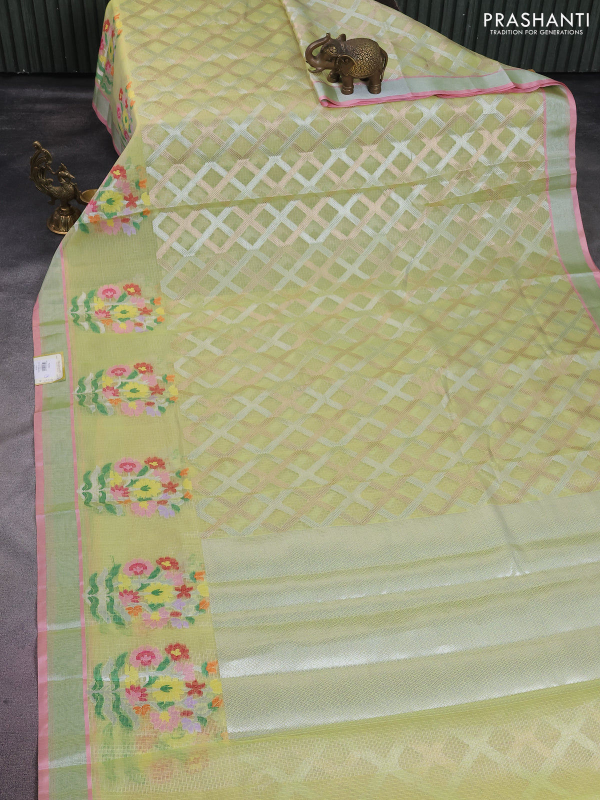 Cotton zari kota saree lime yellow and light pink wit allover silver & gold zari weaves and floral butta silver zari woven border