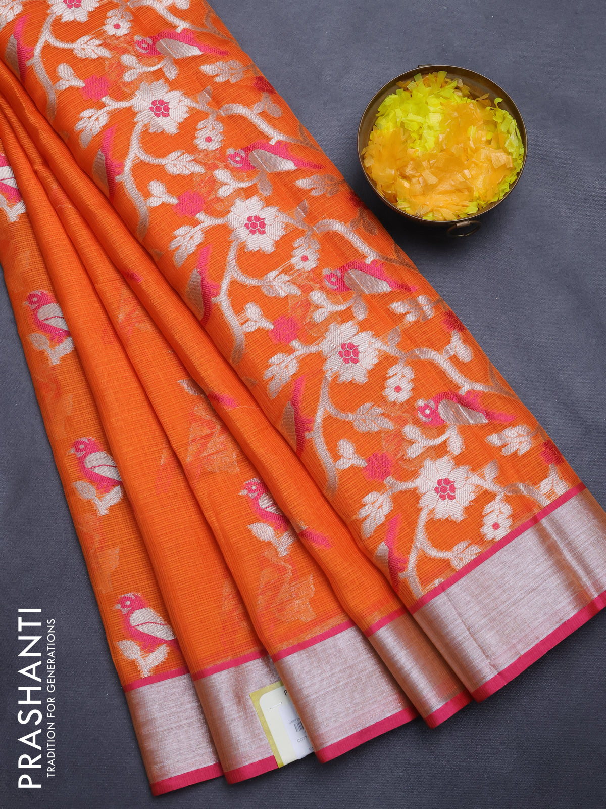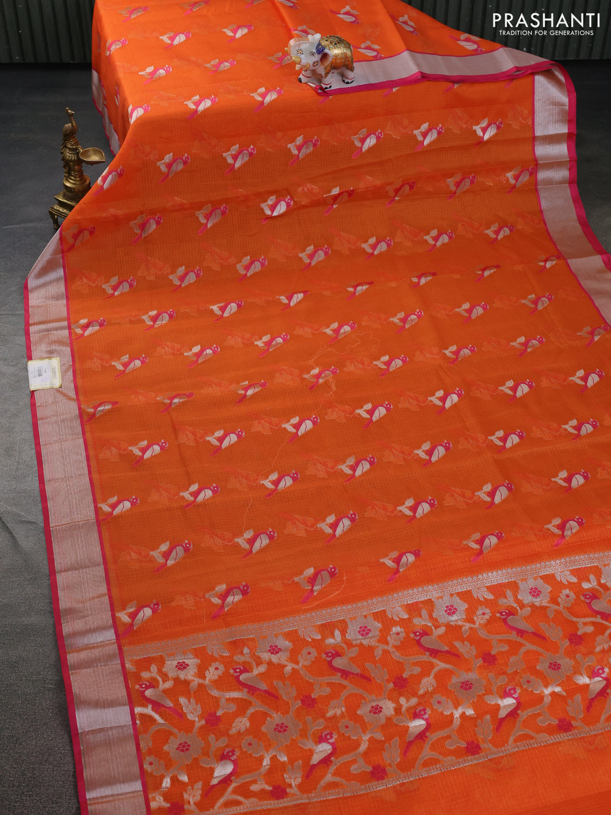 Cotton zari kota saree orange and pink with thread & silver zari woven bird buttas and zari woven border