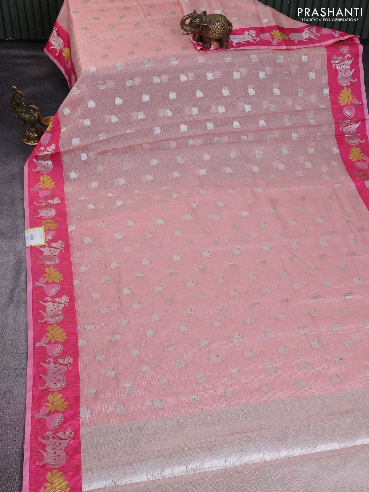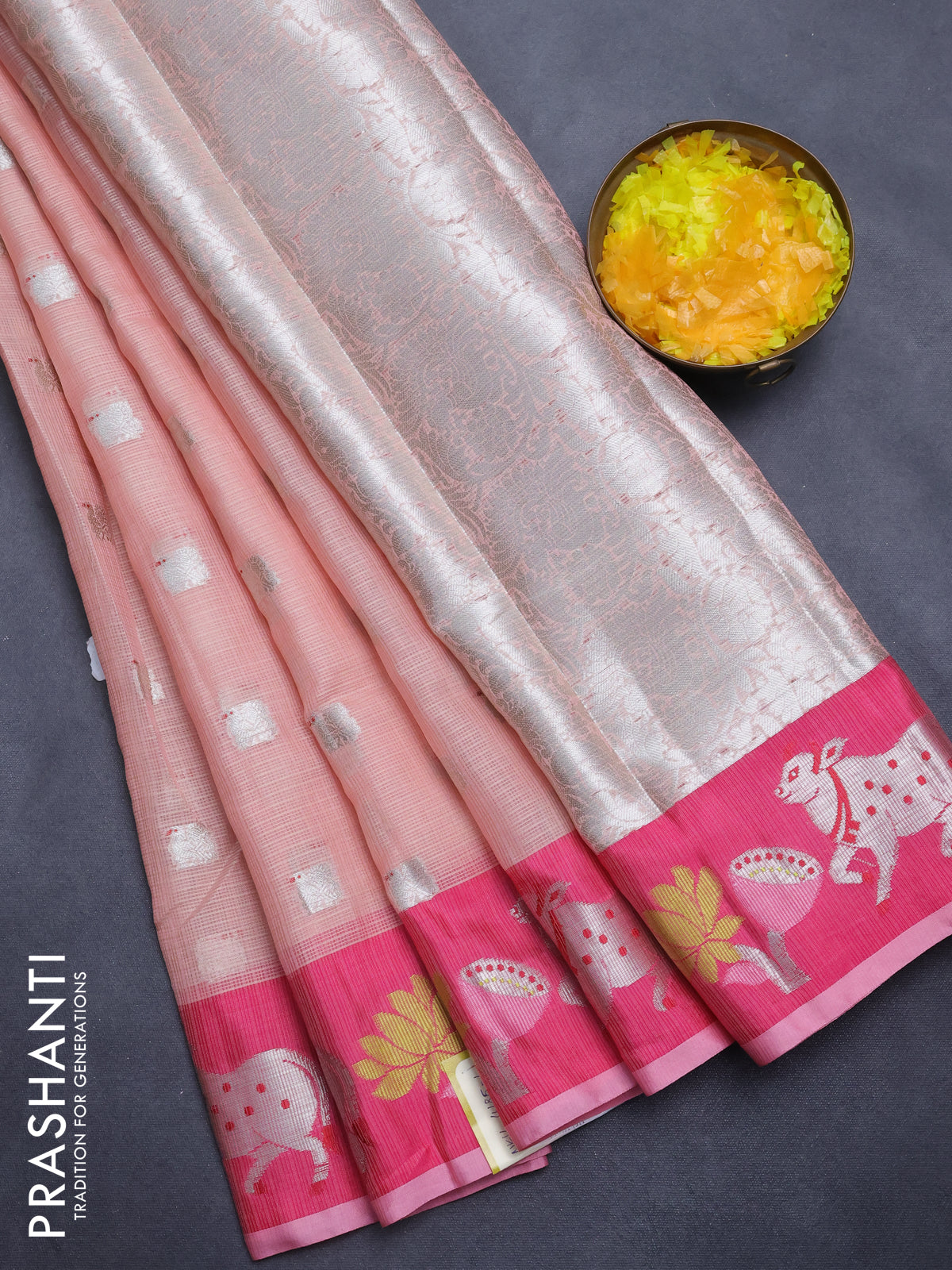 Cotton zari kota saree peach pink and pink with silver zari woven buttas and pichwai design zari border