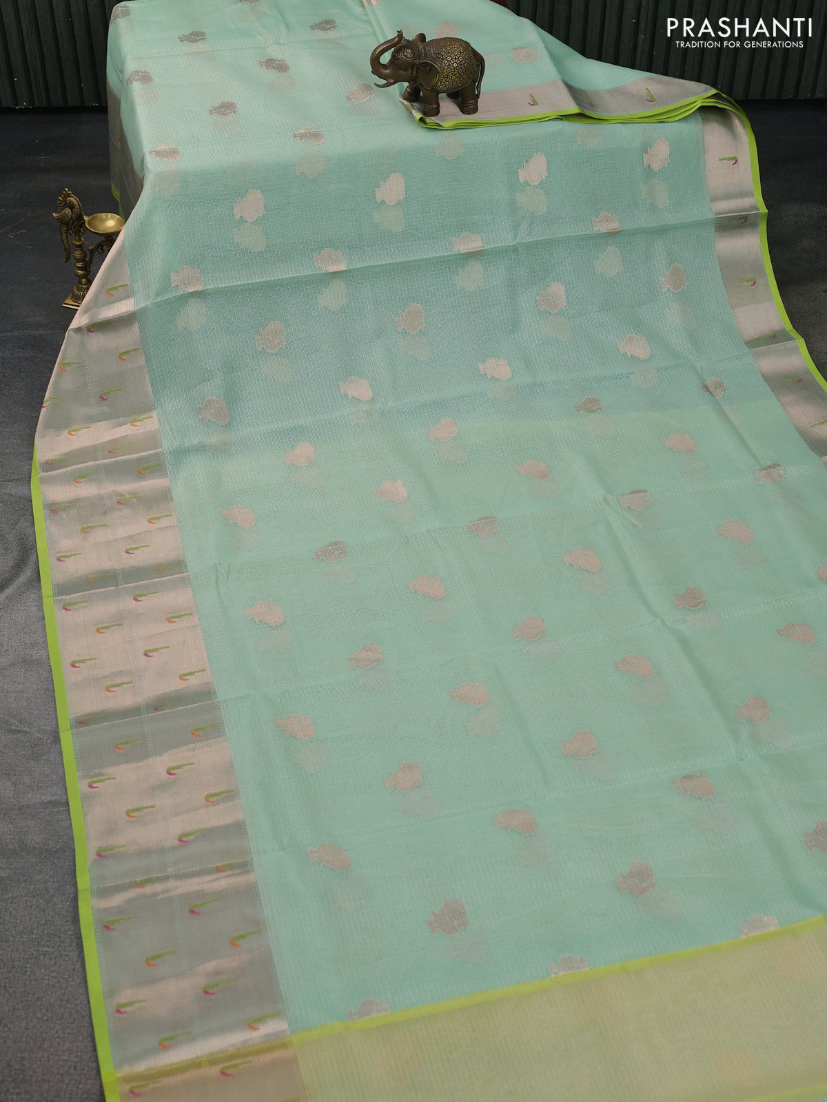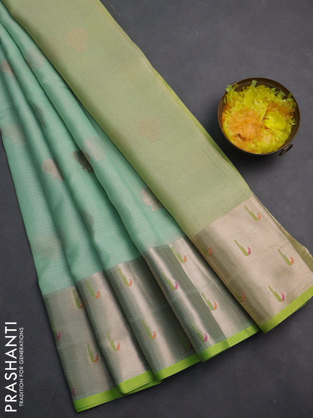 Cotton zari kota saree teal green and lime green with annam zari woven buttas and zari woven muniya butta border