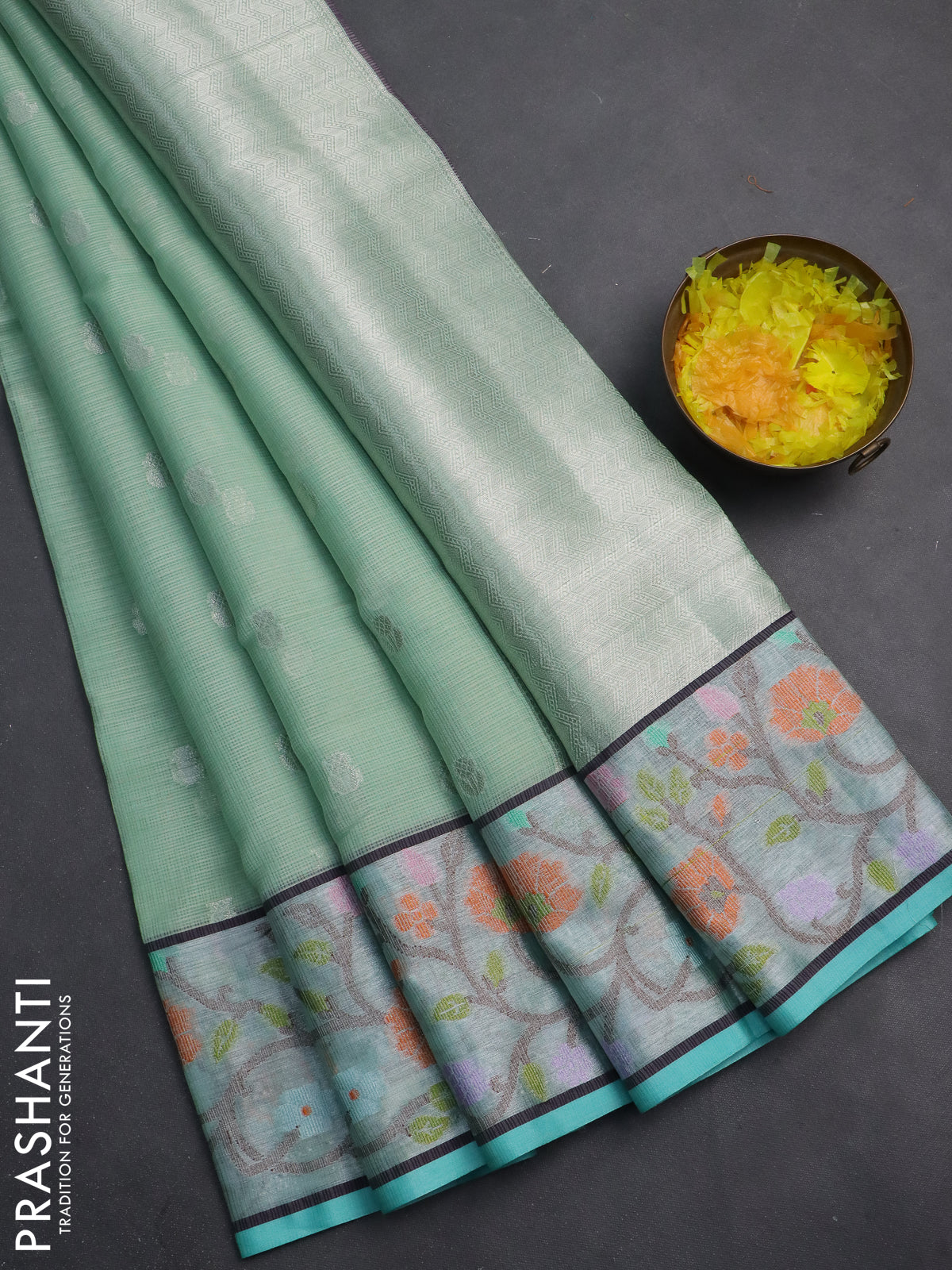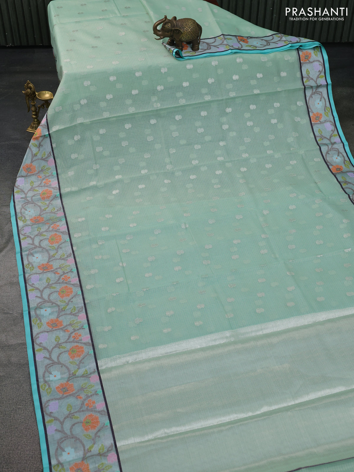 Cotton zari kota saree teal green and teal blue with allover silver zari woven buttas and zari woven paithani border